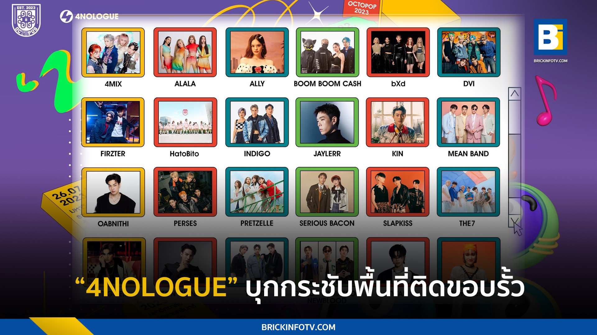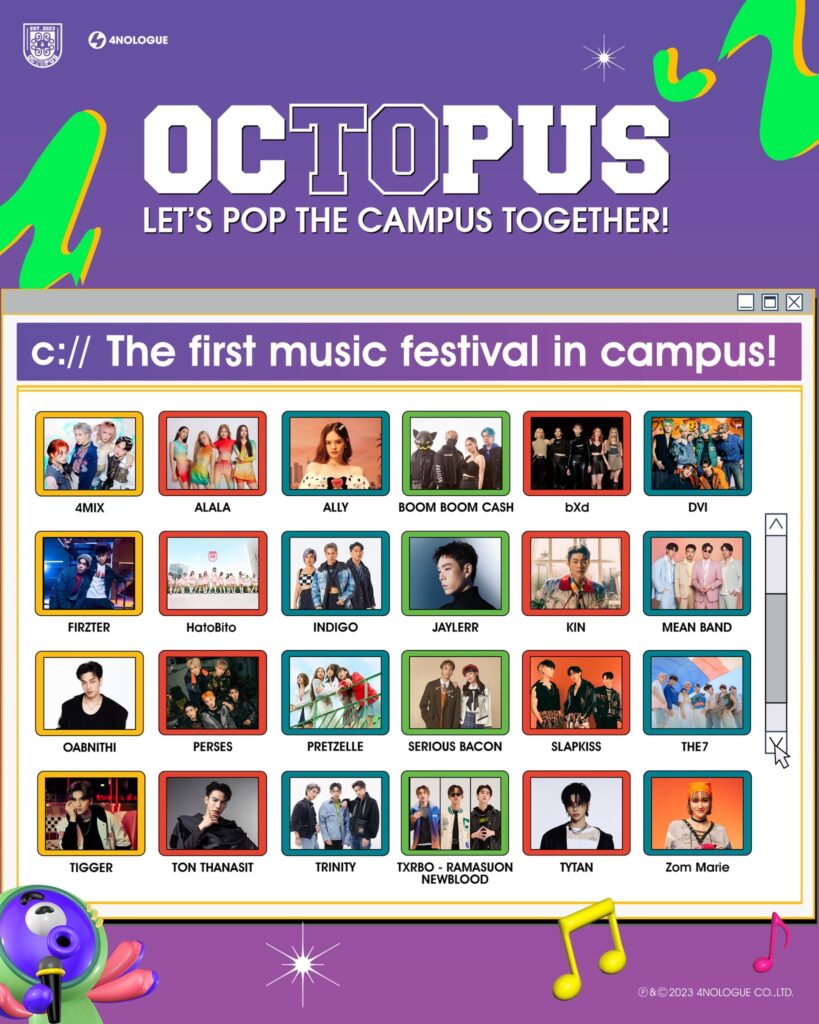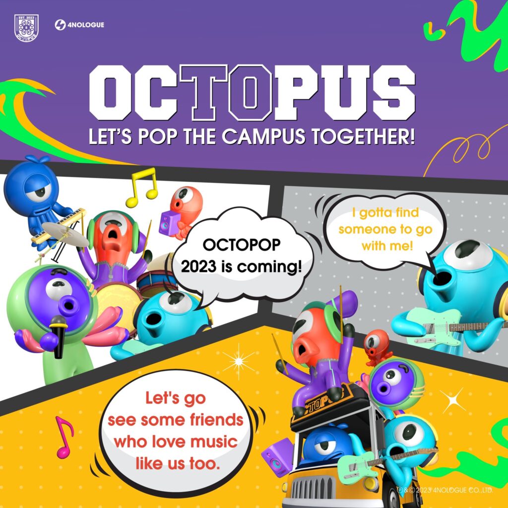 เตรียมเคลื่อนตัวยกขบวนความสนุก บุกไปเสิร์ฟความมันส์กันถึงภายในรั้วโรงเรียนและมหาวิทยาลัยทั่วประเทศ ครั้งแรกของเทศกาลดนตรีในรั้วแคมปัส OCTOPUS (อ็อก-ทู-ปัส) แคมปัสทัวร์คอนเสิร์ตต้อนรับเปิดเทอม Road to ความมันส์สู่ OCTOPOP (อ็อก-โท-ป็อบ) 2023 เมื่อพี่หมึกขอส่งตัวลูกสุดจี๊ด ขนความ POP ฟิน ชิด ติดขอบรั้วทั่วประเทศ โดย “วุธ – อนุวัติ วิเชียรณรัตน์” ประธานกรรมการบริหาร บริษัท โฟร์โนล็อค จำกัด จัดเต็มนำทีมขนทัพศิลปินยกค่าย 4NOLOGUE (โฟร์โนล็อค)