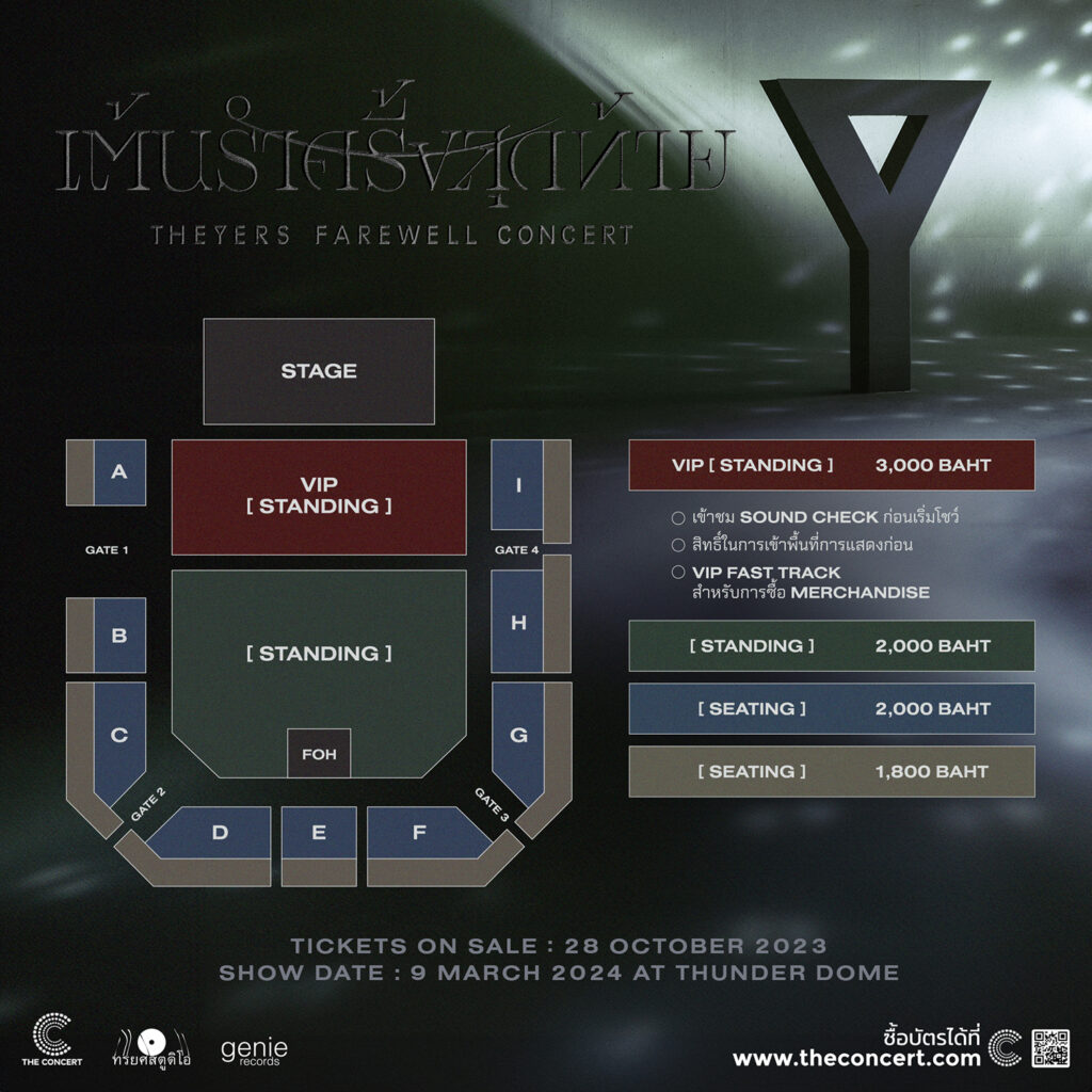 “เต้นรำครั้งสุดท้าย” THE YERS FAREWELL CONCERT จะเปิดจำหน่ายบัตรในวันที่ 28 ตุลาคมนี้ เวลา10.00น. เป็นต้นไป ทาง The Concert Application หรือ www.theconcert.com สำหรับราคาบัตรเข้าชมมีบัตร VIP ราคา 3,000 บาท (ยืน) สามารถเข้าชม Sound Check ก่อนเริ่มโชว์, ได้สิทธิ์ในการเข้าพื้นที่การแสดงก่อน รวมถึงได้ VIP Fast Track สำหรับการซื้อ Merchandise, บัตรราคา 2,000 บาท (นั่งและยืน) และบัตรราคา 1,800 บาท (นั่ง) สามารถติดตามรายละเอียดเพิ่มเติมได้ทาง: www.facebook.com/theyerstheyers