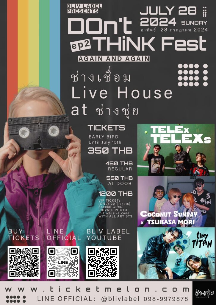 หลังจาก Don’t Think Fest! EP.1 ตอน “คังไกรูน่า!” (มีฝันก็ลุยเลย!) มินิมิวสิคเฟสติวัล ที่ลานเครื่องบิน ช่างชุ่ย ได้แจกความใจฟูไปแล้วเมื่อต้นปี กลางปีนี้ BLIV LABEL (บลิฟ เลเบ็ล) ค่ายเพลงน้องใหม่ แท็คทีมชวนศิลปิน Synthpop จากค่าย Juicey และศิลปินน้องใหม่จากค่าย TINY จาก Loveis Entertainment มาสนุกด้วยกันแบบสุดเหวี่ยงอีกครั้ง ที่ Don’t Think Fest! EP.2 ที่ครั้งนี้ใช้ชื่อตอนว่า “AGAIN AND AGAIN”