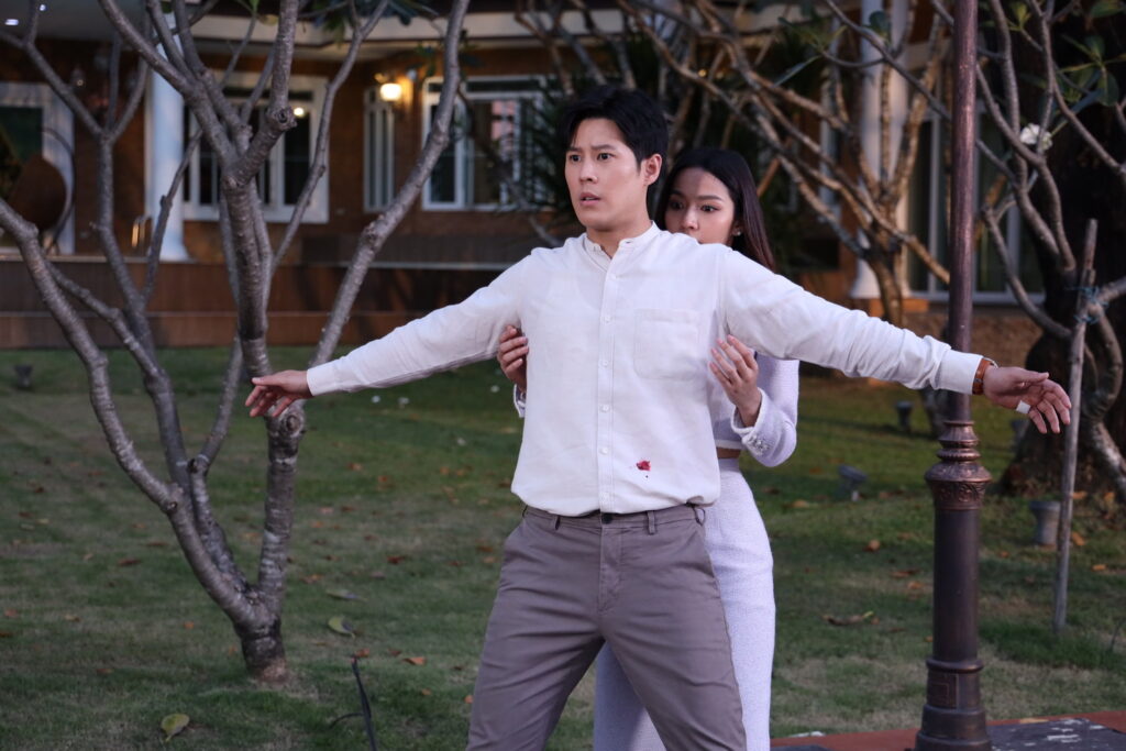 ก่อนไปชมเบื้องหน้าแบบเต็มๆ เรานำภาพเบื้องหลังของฉากนี้มาฝากแฟนๆ เพื่อเรียกน้ำย่อยกันก่อน ความที่เป็นฉากไคลแมกซ์ของเรื่อง ผู้จัดคนเก่ง กบ- ปภัสรา ก็แท็กทีม ร่วมกับสองผู้กำกับฯ อาต้อย-จารึก และ เอ๋-กษมา และทีมงานทุกคนตั้งอกตั้งใจที่จะถ่ายทำฉากนี้ออกมาให้ดีที่สุด เพราะถือเป็นฉากในตอนสุดท้ายของเรื่องแล้ว โดยใช้โลเกชั่นหลัก “บ้านกมลา” เป็นสถานที่ถ่ายทำ