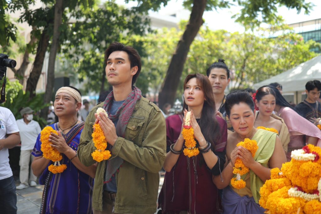 บรรยากาศงานบวงสรวง เมื่อวันที่ 1 พ.ย. ที่ผ่านมา ณ บริเวณ เทวาลัย พระพิฆเนศ ช่อง 7HD เต็มไปด้วยความอบอุ่น นักแสดงมาร่วมพิธีแบบอุ่นหนาฝาคั่ง พร้อมแต่งชุดคอสตูมในละครแบบจัดเต็มทั้งเสื้อผ้า หน้าผม นำโดยคู่พระนาง โอ๊ต-รัฐธีร์ วรโรจน์โยธิน, แก้ม-ญาณิศา ธีราธร ร่วมด้วย หมู-ภูษณะ บัวงาม, เฌอ-เฌอลีนน์ สตาฟฟี่, ฝ้าย-สุภาพร มะลิซ้อน พร้อมขอแนะนำ 2 นักแสดงใหม่ 7HD NEW STARS เดียว-นวบดินทร์ สัณหวัณภัคดี และ วีซ่า-สิมิลัน เตมีวณิชย์ นอกจากนี้ยังมีนักแสดงมากฝีมืออีกมากมาย มาริสา อานิต้า, สวิส เตชภูวนนท์, กุน-กิตติคุณ ตันสุหัส, เซียน-กิติภูมิ บุตรจินดา, ใหญ่-วัชรเกียรติ บุญภักดี, เอ๋-กษมา นิสสัยพันธุ์, ดี้-ปัทมา ปานทอง ฯลฯ