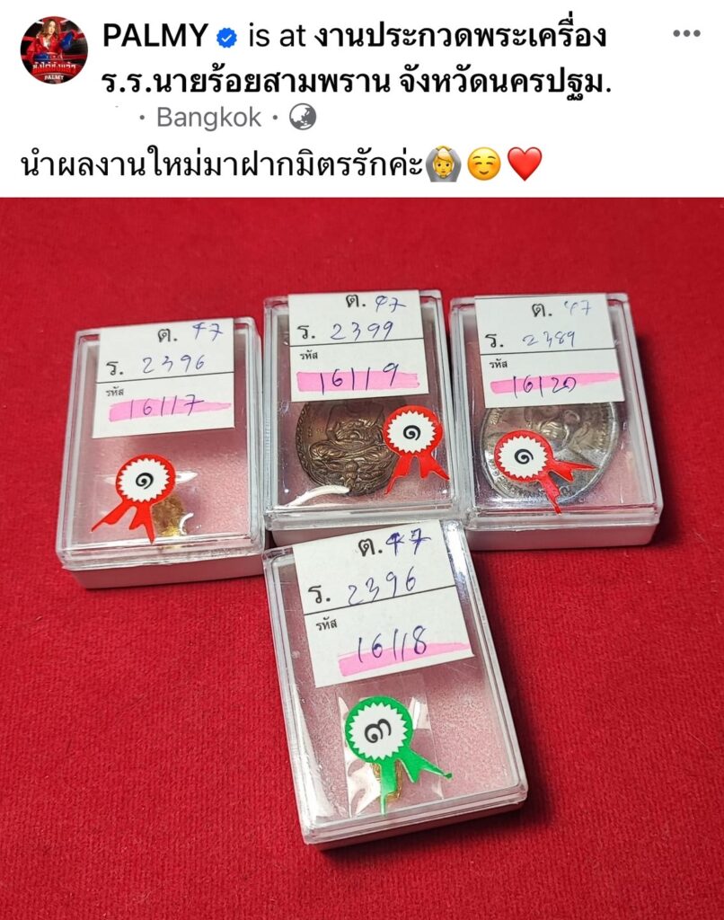 โดนเเซวอีกแล้วว่าเป็นเซียนพระที่ร้องเพลงได้นิดหน่อย ล่าสุด ปาล์มมี่ ส่งพระเข้าประกวดอีกครั้ง และก็คว้ารางวัลมาสดๆร้อนๆจากเวทีการประกวดพระเครื่องโรงเรียนนายร้อยสามพราน จังหวัดนครปฐม ซึ่งถือว่าเป็นเวทีใหญ่ระดับประเทศเลยก็ว่าได้ งานนี้ส่งเข้าประกวด 4 องค์ ก็ได้รางวัลติดเบอร์ทั้ง 4 องค์ สร้างความปลาบปลื้มใจแก่เจ้าของเป็นยิ่งนัก และเป็นความภาคภูมิใจของมิตรรักด้อมปาล์มมี่ที่เเห่มาเเสดงความยินดีกันยกใหญ่เลยทีเดียว