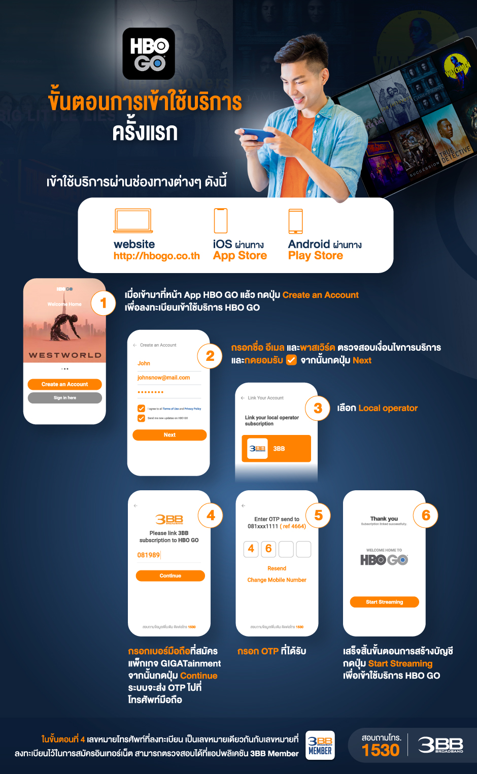 นายยอดชาย อัศวธงชัย กรรมการ บริษัท จัสมิน อินเตอร์เนชั่นแนล จำกัด (มหาชน) หรือ JAS และรองประธานบริหาร สายงานปฏิบัติการ บริษัท ทริปเปิลที บรอดแบนด์ จำกัด (มหาชน) หรือ 3BB กล่าวว่า “ลูกค้า 3BB GIGATainment ฟินกับความบันเทิงจาก HBO GO ได้ทุกที่ ทุกเวลา ด้วยคอมพิวเตอร์ส่วนตัว ผ่าน web browser ที่ website http://hbogo.co.th/ หรือ มือถือโดยโหลดแอปพลิเคชัน HBO GO จาก App Store หรือ Play Store เพื่อสร้างบัญชีเข้าใช้งาน HBO GO จากนั้นสามารถเข้าดูหนังหรือซีรีส์ได้ทันทีครับ ส่วนการรับชมคอนเทนต์ของ MONOMAX ก็แสนง่ายไม่ยุ่งยาก เพียงลูกค้าเข้าแอปพลิเคชัน 3BB Member เลือกไอคอน MONOMAX ก็สามารถใช้บริการ MONOMAX ได้ทันทีเช่นกัน เมื่อสมัคร 3BB GIGATainment แล้วเตรียมตัวชมซีรีส์ยอดนิยมจาก HBO GO อาทิ Westworld ซีซั่น 3 ซีรีส์แนวดราม่า-ไซไฟ สุดตระการตา ที่ทุกคนรอคอย Aquaman หนัง Super Hero กับฉากแอคชั่นสุดมัน Captain America : The First Avenger เรื่องราวของชายร่างเล็กผู้ไม่เคยทิ้งความฝัน และการเข้ามาเป็น Avenger คนแรกของโลก นอกจากนี้ยังมีสุดยอดความบันเทิงจาก MONOMAX ที่ยกกองทัพซีรีส์และหนังดังมาให้ดูแบบจุใจ ตลอดเดือนเมษายน อาทิ แมคกายเวอร์ยอดคนสมองเพชร ปี 3 (Maccyver), ทีมแพทย์สยบคืนวิกฤติ ปี 2 (The Night Shift Season 2), ก๊วนลับฉบับสาวแซ่บ (Book Club) ยอดหญิงแกร่งแห่งทำเนียบขาว ปี 5 (Madam Secretary) และตงกง ตำนานรักตำหนักบูรพา (Goodbye My Princess) ซึ่งคอซีรีส์จีนไม่ควรพลาดเป็นอย่างยิ่ง”