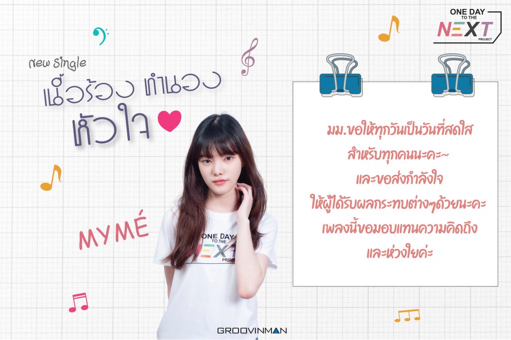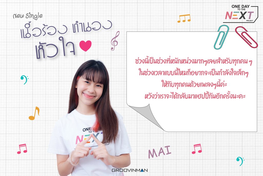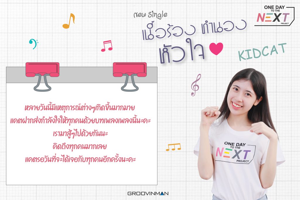 ONE DAY TO THE NEXT PROJECT โปรเจกต์ที่รวบรวมนำศิลปินไอดอลมาสร้างผลงานเพลงร่วมกัน หลังจากที่เคยมีผลงานรวบรวมศิลปินไปแล้วในเพลง Love December ช่วงเดือนธันวาคม และมีเพลงในยูนิตย่อยออกมาอีกหลายเพลง ในเดือนกรกฎาคมนี้ ทางค่าย Groovinman ก็ได้ส่งเพลงใหม่เพื่อเป็นกำลังใจให้ทุกคนในช่วงสถานการณ์นี้ กับเพลง “เนื้อร้อง ทำนอง หัวใจ ♡” โดยศิลปินในโปรเจกต์ทั้ง 9 คน คือ มุก คิตแคต ไหม กุ๊กไก่ ยาหยี มายด์เลิฟ มายเม่ นัชชี่ และศิลปินคนล่าสุดที่เข้าร่วม คือ เจลลี่