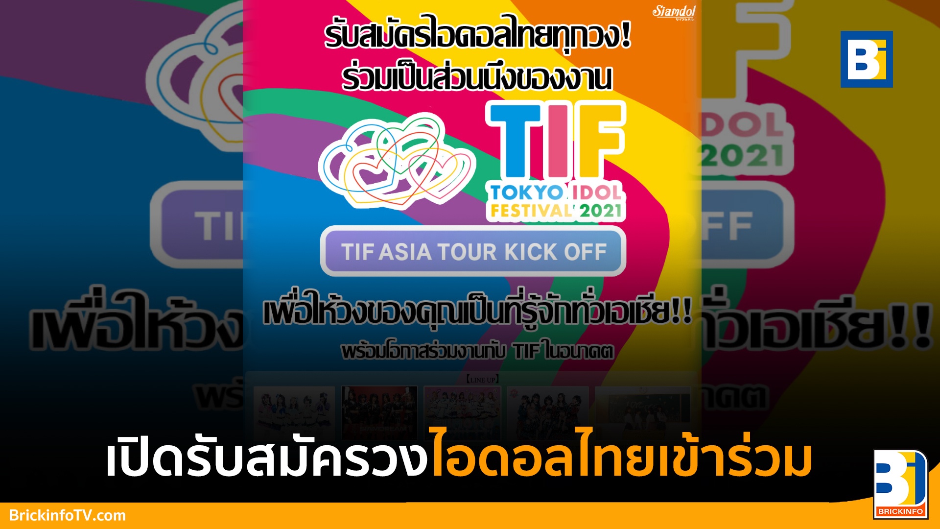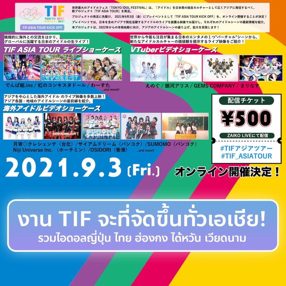 Fuji TV ผู้จัด “Tokyo Idol Festival” เตรียมจัดงาน TIF ASIA TOUR KICK OFF โปรเจ็กต์พิเศษกับการขยายตัวสู่ระดับเอเชีย โดยมีวงไอดอลและ Vtuber เข้าร่วมกิจกรรมมากมาย อาทิ Dempagumi.inc」,Niji no Conquistador」,Wa-suta ,Luna◇Crescente (Taiwan), Niji Universe Inc. (Ho chi minh), OSIDORI (Hongkong) และวงไอดอลจากประเทศไทย Siam☆Dream , SUMOMO โดยจะเปิดการแสดงวันที่ 3 กันยายน 2564 ถ่ายทอดทาง ZAIKO LIVE เวลา: 17:00 น. จำหน่ายราคาตั๋วในราคา 500 เยน