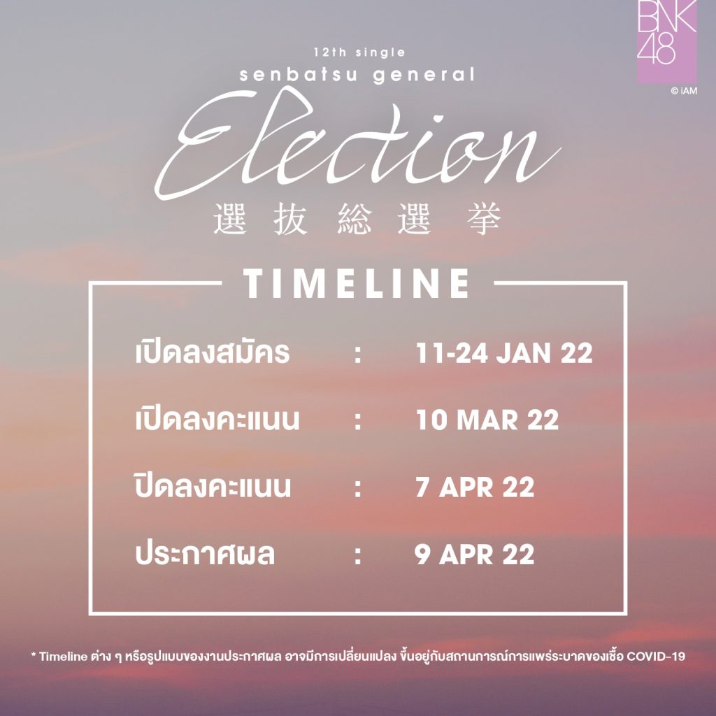 เรียกว่าเป็นอีกหนึ่งกิจกรรมใหญ่ของวงที่หลายๆคนจับตามองเลยทีเดียวสำหรับกิจกรรม Senbatsu General Election โดยกิจกรรมดั่งกล่าวเป็นกิจกรรมหใ้แฟนๆร่วมโหวตสมาชิกที่คุณชื่นชอบเพื่อติดอันดับเป็นเซมบัตสึในซิงเกิลใหม่ โดยครั้งนี้ถือเป็นครั้งที่ 3 ทีไ่ด้มีจัดกิจกรรมนี้ขึ้นในชื่อว่า “BNK48 12th Single Senbatsu General Election” เปิดสมัครระหว่างวันที่ 11-24 มกราคม 2565 และจะประกาศผลวันที่ 9 เมษายน 2565