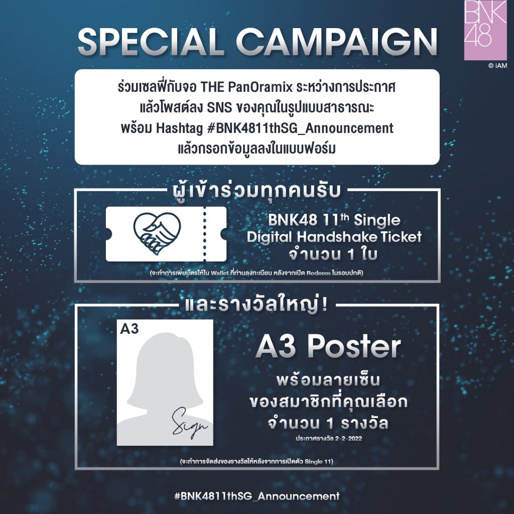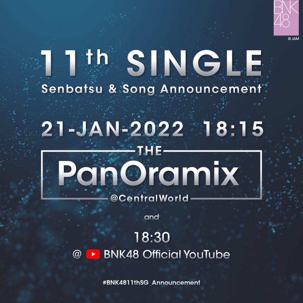 ห่างหายจากการประกาศซิงเกิลใหม่ไปซักพัก กลับมาทีเรียกว่าเล่นใหญ่เลยทีเดียวสำหรับวงไอดอลเกิร์ลกรุ๊ป “ฺBNK48” โดนทางเพจ BNK48 Official ได้มีการโพสต์ข้อความชักชวนแฟนๆมาร่วมลุ้นเซมบัตสึและลุ้นซิงเกิลที่ 11 พร้อมกัน บนจอ THE PanOramix ณ ศูนย์การค้า Central World วันที่ 21 มกราคม นี้ เวลา 18.15 น. นอกจากนี้ทางวงยังได้มีการจัดกิจกรรมสำหรับแฟนๆ ที่ได้ไปรับชมร่วมถ่ายเซลฟี่กับจอ THE PanOramix ระหว่างการประกาศเซ็มบัตสึแล้วโพสต์ลง SNS พร้อมติด Hashtag #BNK4811thSG_Announcement ยังมีสิทธิ์ได้รับบัตรจับมือ BNK48 11th Single Digital Handshake Ticket จำนวน 1 ใบ/สิทธิ์ และร่วมลุ้น Poster ขนาด A3 พร้อมลายเซ็นต์สมาชิกที่คุณเลือกอีก 1 รางวัล อีกด้วย สำหรับเงื่อนไขและรับรางวัลสามารถดูรายละเอียดได้ที่เพจ BNK48 และรับชมการประกาศทาง BNK48 Official YouTube ในเวลา 18:30 น.
