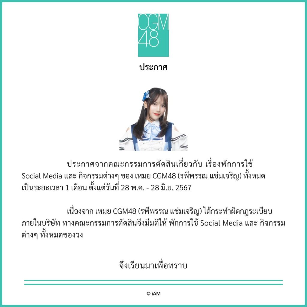 วงไอดอล CGM48 วงไอดอลน้องสาวจากเชียงใหม่ BNK48 สังกัด iAM ได้มีการโพสต์ข้อความลงโทษ 2 สมาชิก “แองเจิ้ล CGM48” (ประกาศวันที่ 27 พ.ค 67) และ “เหมย CGM48” (ประกาศวันที่ 28 พ.ค 67) เนื่องจากได้กระทำความผิดกฏของวง โดยบทลงโทษดั่งกล่าวทั้ง 2 คนจะถูกงดการโซเชียลมีเดียและกิจกรรมที่จะเกิดขึ้นของวงเป็นระยะเวลา 1 เดือน