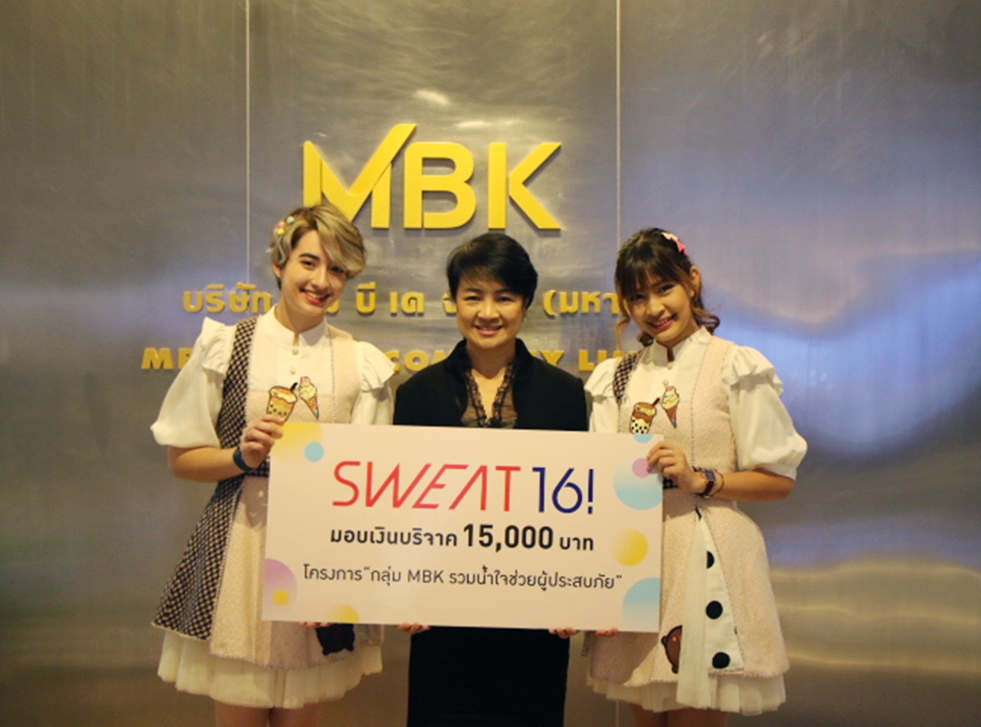 2 สาว เฟรม (ซ้ายสุด) และ ซอนญา (ขวาสุด) เป็นตัวแทนไอดอลเกิร์ลกรุ๊ปวง SWEAT16! (สเวทซิกซ์ทีน!) มอบเงินบริจาคสนับสนุนโครงการ “กลุ่ม MBK รวมน้ำใจช่วยผู้ประสบภัย” กิจกรรมดี ๆ ของ บริษัท เอ็ม บี เค จำกัด (มหาชน) ซึ่งจะนำไปมอบให้กับสภากาชาดไทย สมทบเข้ากองทุนเงินช่วยเหลือผู้ประสบสาธารณภัย เพื่อช่วยเหลือและฟื้นฟูผู้ประสบอุทกภัยในพื้นที่ภาคตะวันออกเฉียงเหนือ โดยมี ศตกมล วรกุล (กลาง) ผู้อำนวยการฝ่ายสื่อสารองค์กร บริษัท เอ็ม บี เค จำกัด (มหาชน) เป็นผู้รับมอบ เมื่อเร็ว ๆ นี้