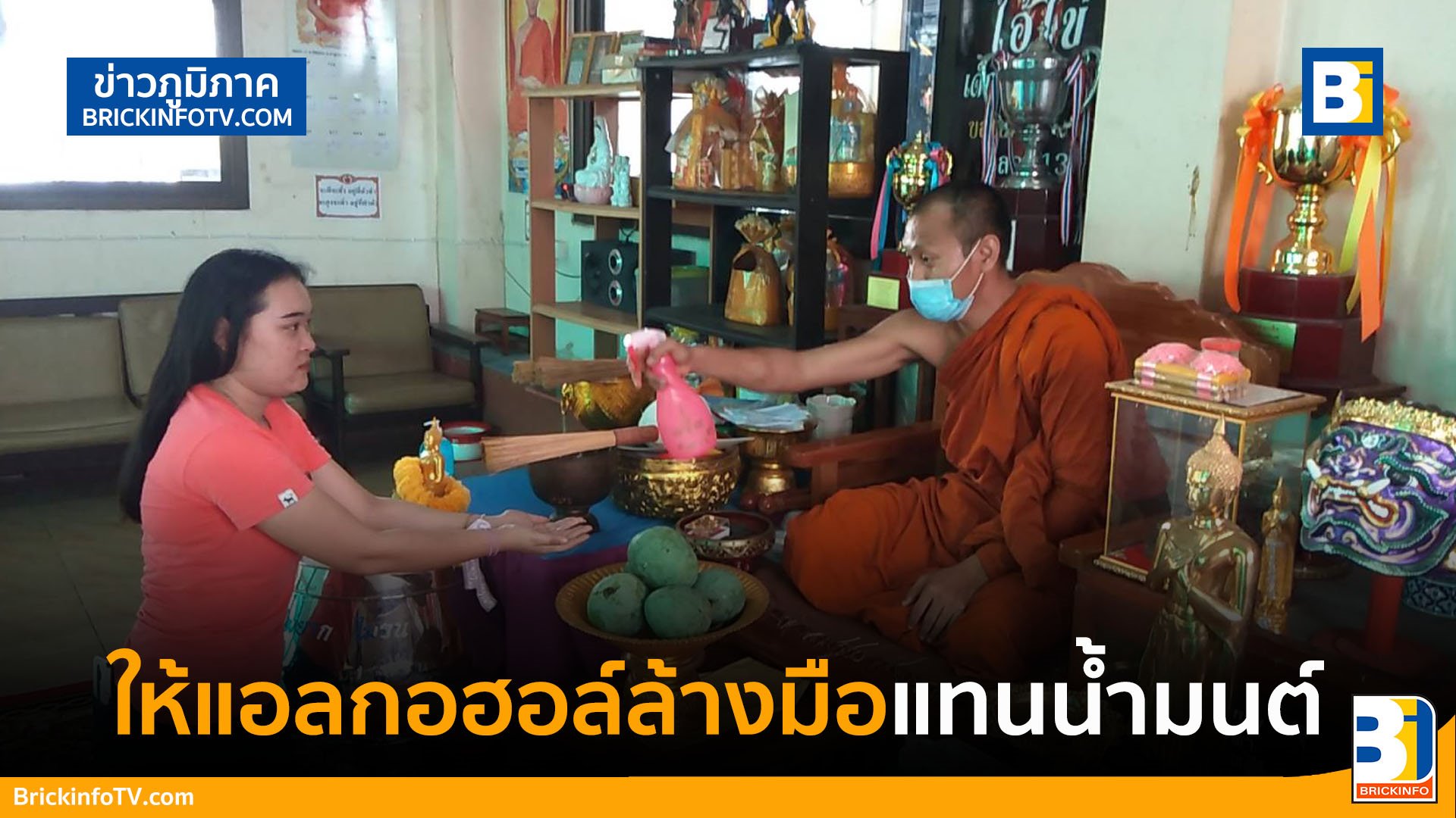 ปทุมธานี – เจ้าอาวาส ผุดไอเดียใช้ฟ๊อกกี้ใส่แอลกอฮอล์ให้ญาติโยมล้างมือแทนน้ำมนต์