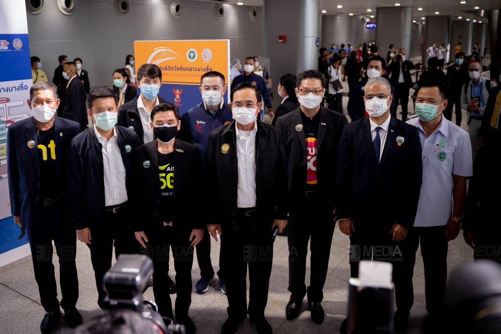 สถานีกลางบางซื่อ 7 มิถุนายน 2564 – วันแรกของการเปิดบริการฉีดวัคซีนป้องกันเชื้อโควิด-19 ทั่วประเทศ นายกรัฐมนตรี พลเอก ประยุทธ์ จันทร์โอชา เดินทางมาตรวจเยี่ยมศูนย์ฉีดวัคซีนกลางบางซื่อ พร้อมด้วย นายอนุทิน ชาญวีรกูล รองนายกรัฐมนตรีและรัฐมนตรีว่าการกระทรวงสาธารณสุข นายศักดิ์สยาม ชิดชอบ รัฐมนตรีว่าการกระทรวงคมนาคม และนายชัยวุฒิ ธนาคมานุสรณ์ รัฐมนตรีว่าการกระทรวงดิจิทัลเพื่อเศรษฐกิจและสังคม ณ สถานีกลางบางซื่อ ซึ่งเป็นความร่วมมือระหว่างกระทรวงคมนาคม กระทรวงสาธารณสุข กสทช. และผู้ให้บริการสื่อสารโทรคมนาคม ซึ่งรวมถึงกลุ่มทรู โดย นายมนัสส์ มานะวุฒิเวช กรรมการผู้จัดการใหญ่ (ร่วม) บมจ. ทรู คอร์ปอเรชั่น