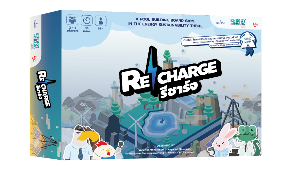 บอร์ดเกม Recharge เป็นเกมแนวพัฒนากองทรัพยากร (Pool Building) ผู้เล่นจะได้รับบทเป็นผู้ผลิตไฟฟ้าเอกชนที่ประจำอยู่ในมหานครสัตว์ขนาดใหญ่ ดินแดนที่ต้องพึ่งพาพลังงานจากไฟฟ้าหลายแหล่ง ผู้เล่นจะต้องจัดสรรทรัพยากร และวางแผนพัฒนาและเดินเครื่องโรงไฟฟ้าให้สามารถผลิตไฟฟ้าตอบสนองความต้องการ ใช้พลังงานที่เพิ่มขึ้นอย่างรวดเร็วจากการขยายตัวของธุรกิจและอุตสาหกรรมในมหานครสัตว์แห่งนี้ โดยผู้เล่น ที่บริหารจัดการโรงไฟฟ้าและธุรกิจต่างๆ ได้อย่างเหมาะสม ควบคู่ไปกับการสร้างพลังงานได้อย่างสมดุล มีเสถียรภาพ และเป็นมิตรต่อสิ่งแวดล้อมมากที่สุดจะเป็นผู้ชนะ ติดตามคลิปแนะนำเกมได้ที่ https://www.facebook.com/BanpuBSportsThailand/videos/1155018514965065