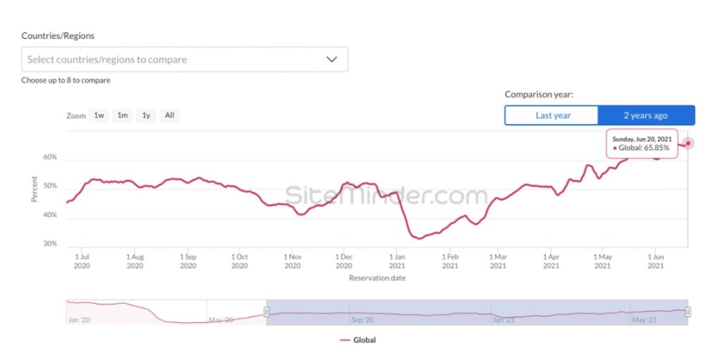 ยอดผู้ติดเชื้อที่มีจำนวนลดลง การแจกจ่ายวัคซีน และการผ่อนปรนมาตรการต่างๆ ทำให้อัตราการจองโรงแรมทั่วโลกปัจจุบัน เพิ่มสูงขึ้น โดยนับว่าสูงที่สุดนับตั้งแต่เกิดการแพร่ระบาดของไวรัสโควิด-19 โดยในช่วงที่ผ่านมา มีอัตราการจองเพิ่มขึ้นกว่า 65% ของยอดจองที่พักปี 2019 นับเป็นยอดจองที่สูงที่สุดในรอบ 465 วันเลยทีเดียว