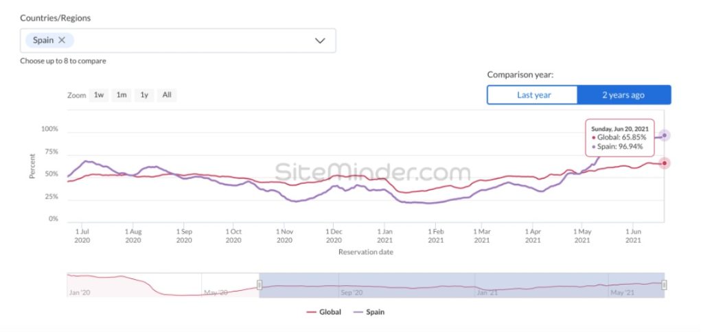 ตั้งแต่ต้นเดือนเมษายนที่ผ่านมา อัตราการจองโรงแรมในสเปน คิดเป็นเพียง 38% ของปี 2019 เท่านั้น ซึ่งสูงกว่าอัตราการจองในประเทศไทยในตอนนี้เพียง 13% อย่างไรก็ตาม ภายหลังจากที่สเปน อนุญาตให้นักท่องเที่ยวที่ได้รับวัคซีนเรียบร้อยแล้ว สามารถเดินทางเข้าประเทศโดยไม่ต้องกักตัวได้ตั้งแต่วันที่ 7 มิถุนายน ที่ผ่านมา อัตราการจองโรงแรมจากนักท่องเที่ยวทั้งในประเทศ และต่างประเทศ มีจำนวนเพิ่มสูงขึ้นภายในระยะเวลาไม่กี่สัปดาห์ โดยคิดเป็น 97% ของปี 2019 ซึ่งนับเป็นการเติบโตที่น่าประทับใจมาก