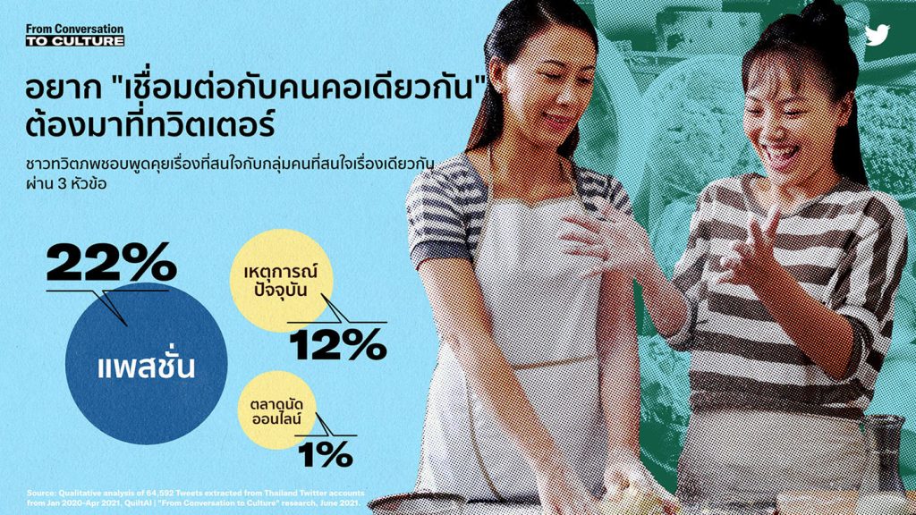 ทวิตเตอร์ได้กลายเป็นส่วนที่มีความสำคัญต่อชีวิตของคนไทย จากงานวิจัยพบว่า  การเชื่อมต่อกับคนคอเดียวกันมีสัดส่วน 35% ของปริมาณบทสนทนาทั้งหมดบนทวิตเตอร์ประเทศไทย คนไทยได้ใช้ทวิตเตอร์อย่างกระตือรือร้นเพื่อให้มีการเชื่อมต่อกับชุมชนของเขาอยู่ตลอดเวลา รวมถึงเพื่อเป็นการอัปเดต #WhatsHappening  ในสิ่งที่กำลังเกิดขึ้น คนไทยมักจะทวีตเกี่ยวกับหลากหลายเหตุการปัจจุบันอย่างสม่ำเสมอตั้งแต่เรื่องโควิด-19 สกุลเงินคริปโต ไปจนถึงการเมืองในประเทศและในแถบภูมิภาคนี้