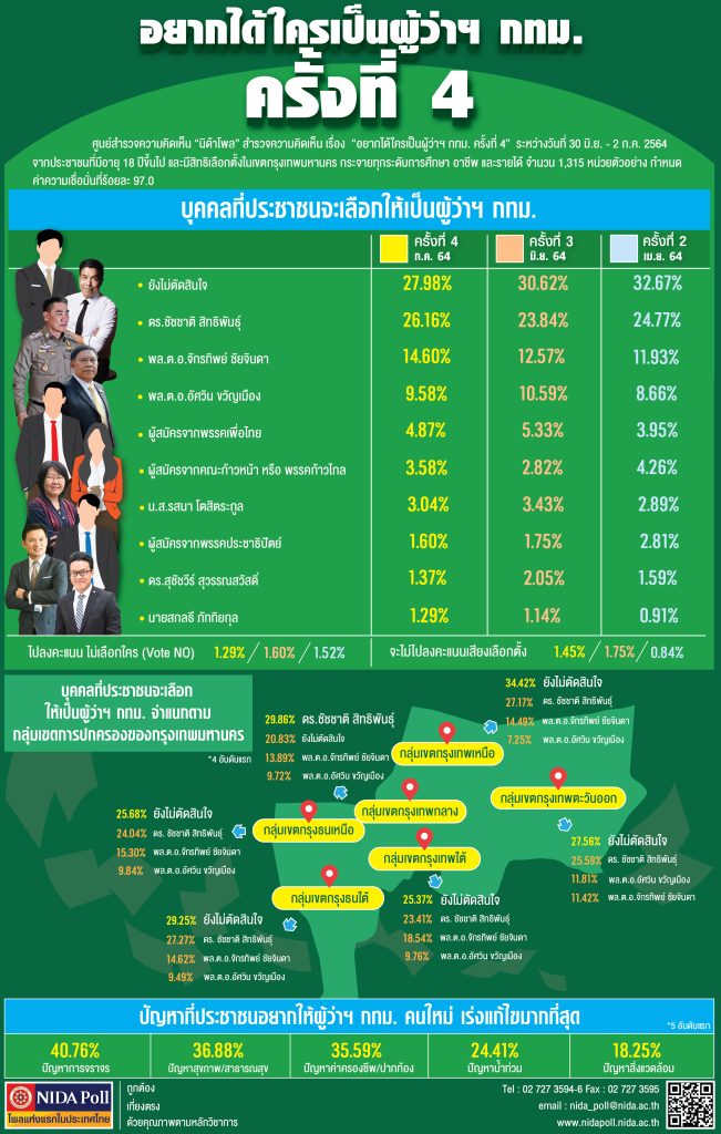 ศูนย์สำรวจความคิดเห็น “นิด้าโพล” สถาบันบัณฑิตพัฒนบริหารศาสตร์ (นิด้า) เปิดเผยผลสำรวจของประชาชน เรื่อง “อยากได้ใครเป็นผู้ว่าฯ กทม. ครั้งที่ 4” ทำการสำรวจระหว่างวันที่ 30 มิถุนายน – 2 กรกฎาคม 2564 จากประชาชนที่มีอายุ 18 ปีขึ้นไป และมีสิทธิเลือกตั้งในกรุงเทพมหานคร กระจายทุกระดับการศึกษา อาชีพ และรายได้ รวมทั้งสิ้น จำนวน 1,315 หน่วยตัวอย่าง เกี่ยวกับประชาชนอยากได้ใครเป็น ผู้ว่าฯ กทม. ครั้งที่ 3 การสำรวจอาศัยการสุ่มตัวอย่างโดยใช้ความน่าจะเป็นจากบัญชีรายชื่อฐานข้อมูลตัวอย่างหลัก (Master Sample) ของ “นิด้าโพล” สุ่มตัวอย่างด้วยวิธีแบบง่าย (Simple Random Sampling) เก็บข้อมูลด้วยวิธีการสัมภาษณ์ทางโทรศัพท์ โดยกำหนดค่าความเชื่อมั่นที่ร้อยละ 97.0