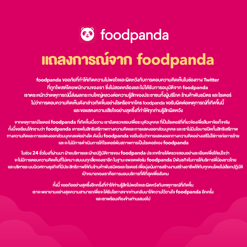 “ในช่วง 24 ชั่วโมงที่ผ่านมา ฝ่ายบริหารและฝ่ายปฏิบัติการของฟู้ดแพนด้าประเทศไทย ได้ตรวจสอบอย่างละเอียดเพื่อให้แน่ใจว่า จะไม่มีการตอบความคิดเห็นที่ไม่เหมาะสมบนทุกสื่อของเราอีก ในฐานะแพลตฟอร์ม ฟู้ดแพนด้ามีพันธกิจในการให้บริการ พี่น้องชาวไทย และบริหารระบบนิเวศทางธุรกิจที่มีประสิทธิภาพให้กับร้านค้าพันธมิตรและไรเดอร์เพื่อมุ่งเน้นการสร้างงาน สร้างอาชีพให้กับทุกคนโดยไม่เลือกปฏิบัติ”