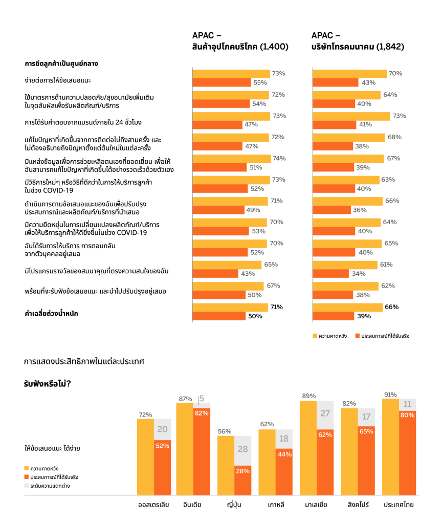 เมื่อเทียบกับความคาดหวังของลูกค้าในภูมิภาคเอเชียแปซิฟิกและสิ่งที่พวกเขาประสบในความเป็นจริง ส่วนที่พบว่าธุรกิจยังขาดประสิทธิภาพอยู่ ได้แก่ การตอบสนองต่อคำถามของลูกค้าภายใน 24 ชั่วโมง (73% เทียบกับ 48%) การตอบสนองต่อความคิดเห็นของลูกค้าเพื่อปรับปรุงผลิตภัณฑ์และบริการ (72% เทียบกับ 48%) การแก้ไขปัญหาจนลุล่วงภายในการโต้ตอบน้อยกว่าสามครั้ง (73% เทียบกับ 48%) การแนะนำแหล่งข้อมูลเพื่อช่วยเหลือตนเองให้สามารถแก้ปัญหาได้อย่างรวดเร็ว (73% เทียบกับ 49%) และการนำเสนอวิธีการใหม่ๆ หรือวิธีที่ดีกว่าในการให้บริการลูกค้าในระหว่างช่วงการระบาดของ COVID -19 (72% เทียบกับ 53%)