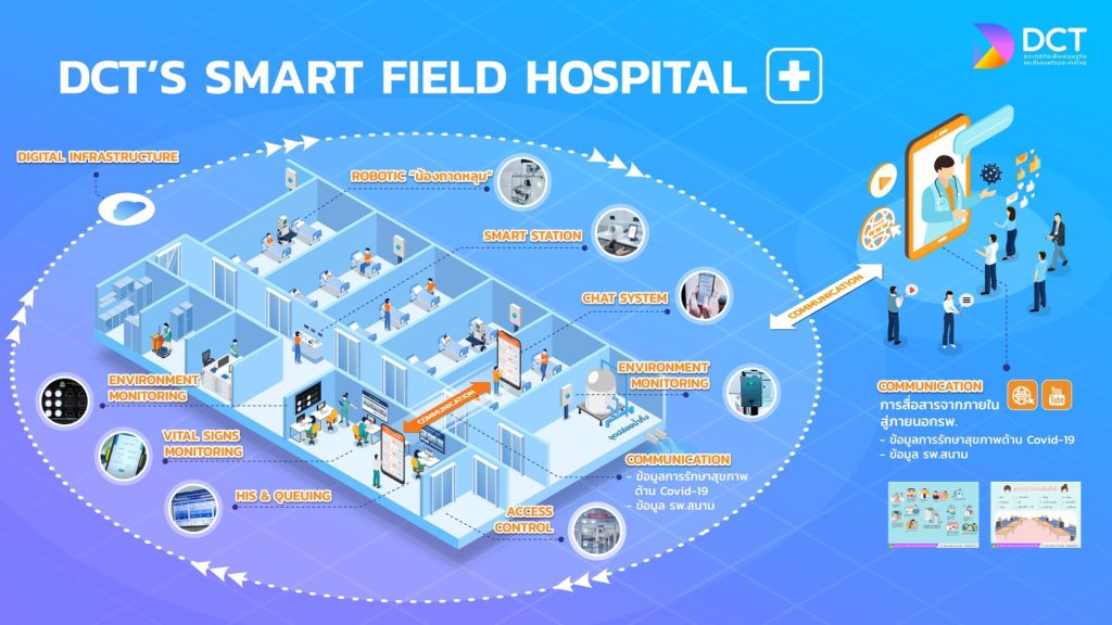 “Smart Field Hospital” เป็นต้นแบบโรงพยาบาลสนามดิจิทัลที่ได้เริ่มติดตั้งในรพ.สนาม 3 แห่ง ได้แก่ รพ.สนามจุฬาลงกรณ์มหาวิทยาลัย, รพ.สนามกองทัพอากาศ ดอนเมือง และ รพ.สนามธรรมศาสตร์ พร้อมขยายผลสู่คู่มือแนวปฏิบัติโรงพยาบาลสนามดิจิทัล เพื่อให้โรงพยาบาลสนามต่าง ๆ นำไปเป็นแนวทางในการเสริมระบบและเชื่อมโยงการรักษาผู้ป่วยที่ติดเชื้อโควิด 19 ด้วยเทคโนโลยีดิจิทัลอย่างมีประสิทธิภาพ รวมถึงลดความเสี่ยงระหว่างบุคลากรทางการแพทย์และผู้ป่วย