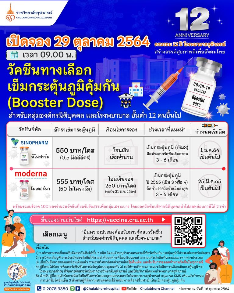 วันนี้ 16 ต.ค. ศูนย์ข้อมูลราชวิทยาลัยจุฬาภรณ์ เปิดเผยผ่านเฟซบุ๊กโดยระบุว่า ในวันที่ 29 ตุลาคมนี้ จะเปิดให้องค์กรนิติบุคคล และโรงพยาบาลที่ให้บริการฉีดวัคซีนซิโนฟาร์ม ขั้นต่ำ 12 คนขึ้นไป สามารถจองวัคซีนทางเลือก เข็มกระตุ้นภูมิคุ้มกัน (Booster Dose) โดยกำหนดราคาวัคซีนโมเดอร์นา อยู่ที่ราคา 555 บาท/โดส (ขนาด 50 ไมโครกรัม) ทั้งนี้เนื่องจาก ในโอกาสครบรอบ 12 ปี โรงพยาบาลจุฬาภรณ์ สร้างสรรค์สุขภาพดีเพื่อสังคมไทย