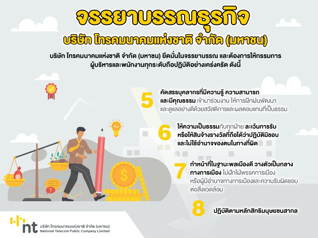 ทั้งนี้ NT จะยังคงยืนหยัดรักษามาตรฐานการบริหารจัดการองค์กรตามหลักการกำกับดูแลกิจการที่ดี มุ่งมั่นบริหารงานและกำกับดูแลการดำเนินงานให้มีคุณธรรม และให้ความสำคัญกับความโปร่งใสขององค์กร โดยเฉพาะอย่างยิ่งการให้ความสำคัญกับการจัดการข้อมูลข่าวสารอย่างเป็นระบบเพื่อเตรียมความพร้อมในการเปิดเผยข้อมูลต่อสาธารณชน เพื่อมุ่งมั่นพัฒนาสู่ความเป็นเลิศในการเป็นองค์กรที่มีคุณธรรมและความโปร่งใสตามหลักธรรมาภิบาล และรับผิดชอบต่อผู้มีส่วนได้ส่วนเสียเพื่อให้เกิดประโยชน์สู่องค์กรได้อย่างยั่งยืน