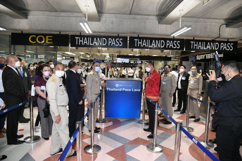 โดยคณะฯ ได้ตรวจการเตรียมพร้อมบริเวณจุดตรวจ Scan QR Code Thailand Pass ของด่านควบคุมโรคติดต่อระหว่างประเทศท่าอากาศยานสุวรรณภูมิ ณ อาคารเทียบเครื่องบิน C กองบังคับการตรวจคนเข้าเมือง 2 ณ จุดตรวจหนังสือเดินทางฝั่งตะวันตก จุดนัดพบระหว่างผู้โดยสารและโรงแรมสถานที่กักตัวทางเลือก (Alternative Quarantine) ณ ช่องทางออก C โถงผู้โดยสารขาเข้า ชั้น 2 อาคารผู้โดยสาร รวมทั้งสำรวจความพร้อมด้านการบริหารจัดการระบบขนส่งสำหรับนักท่องเที่ยวบริเวณประตู 9 ชั้น 2 อาคารผู้โดยสารท่าอากาศยานสุวรรณภูมิ จากนั้นคณะฯ เดินทางไปโรงแรม Bangkok Marriott Marquis Queen’s Park เพื่อสำรวจความพร้อมมาตรฐานการบริหารจัดการห้องพัก พื้นที่สาธารณะ และร้านอาหาร ตามมาตรการสาธารณสุข และมาตรฐาน Amazing Thailand Safety & Health Administration (SHA) และ (SHA+)