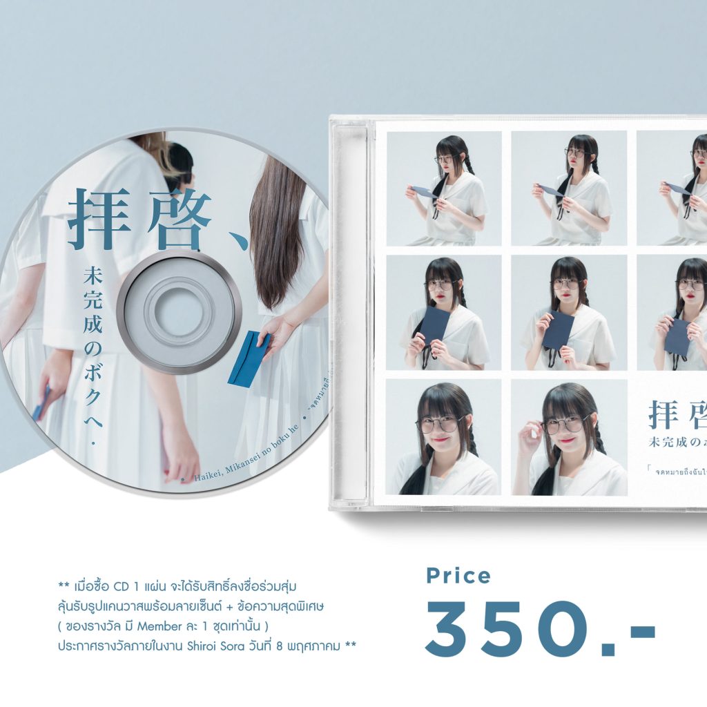 โดยจะเปิดจำหน่ายสำหรับผู้ที่สนใจ สามารถมาซื้อซีดีรอบแรกได้ที่งาน “Shiroi Sora” วันที่ 8 พฤษภาคม นี้ ที่ Donki Mall Thonglor โดยบูทกิจกรรมจะเริ่มตั้งแต่เวลา 16.45 น. เป็นต้นไป โดยสิทธิพิเศษสำหรับคนที่ซื้อซิงเกิ้ลภายในงาน Shiroi Sora เมื่อซื้อ CD 1 แผ่น (มีจำนวนจำกัด) รับ Lucky Draw ticket เพื่อร่วมสุ่มรับรูปแคนวาสพร้อมลายเซ็นต์สุดพิเศษ โดยจะประกาศรางวัลหลังเสร็จสิ้นกิจกรรมในวันเดียวกัน เวลาโดยประมาณ 20.00 น. และจะเปิดรอบพรีออเดอร์หลังจากจบงานทาง Line Myshop สามารถสอบถามรายละเอียดเพิ่มเติมได้ที่ https://www.facebook.com/sorasora.idol