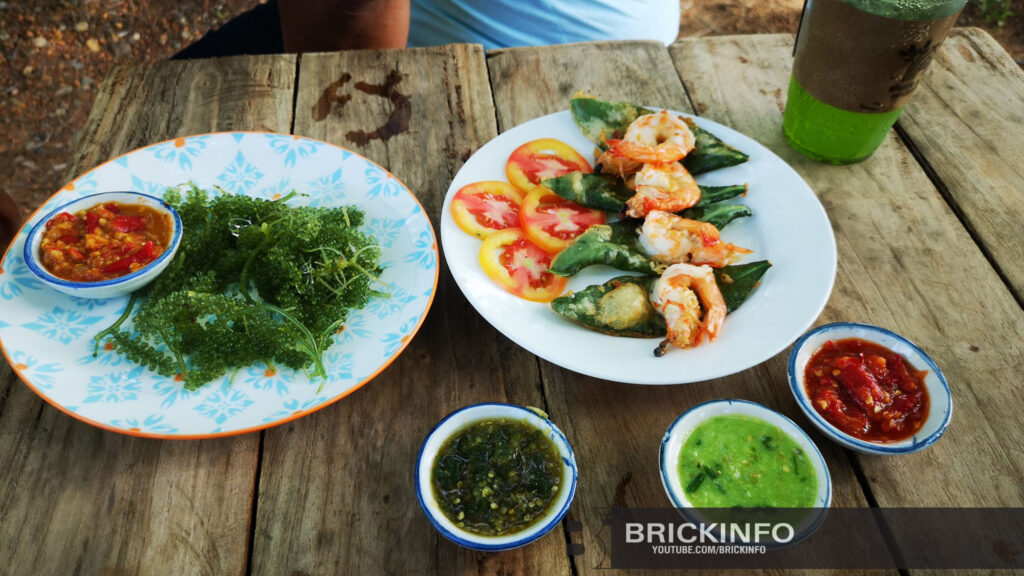 นอกจากนี้ ยังนำวัตถุดิบหลักคือ สาหร่ายพวงองุ่น มาทำเป็นเครื่องดื่ม “น้ำสาหร่าย” ขายในราคาแก้วละ 40 บาท ซึ่งต้องใช้เวลาทดลองกว่าจะได้สูตรลงตัวค่อนข้างเยอะ ด้วยการใช้สาหร่ายสดๆ ในปริมาณ 1 ขีด เอามาปั่นเพื่อสกัดเป็นน้ำออกมา แล้วผสมโซดา และน้ำผึ้ง เพื่อช่วยดับกลิ่นคาว และเมื่อดื่มแล้วจะทำให้รู้สึกสดชื่น ดังนั้น เมื่อลูกค้ามาซื้อสาหร่าย ก็สามารถนั่งจิบกาแฟ ดื่มน้ำสาหร่าย ทานยำสาหร่าย หรือส้มตำสาหร่ายพวงองุ่น รวมทั้งชิมเมนูเทมปุระใบโกงกาง และอาหารอื่น ๆ ในราคาเริ่มต้นที่ 20-60 บาท เน้นขายไม่แพง สะอาด อร่อย การันตีวัตถุดิบสดใหม่