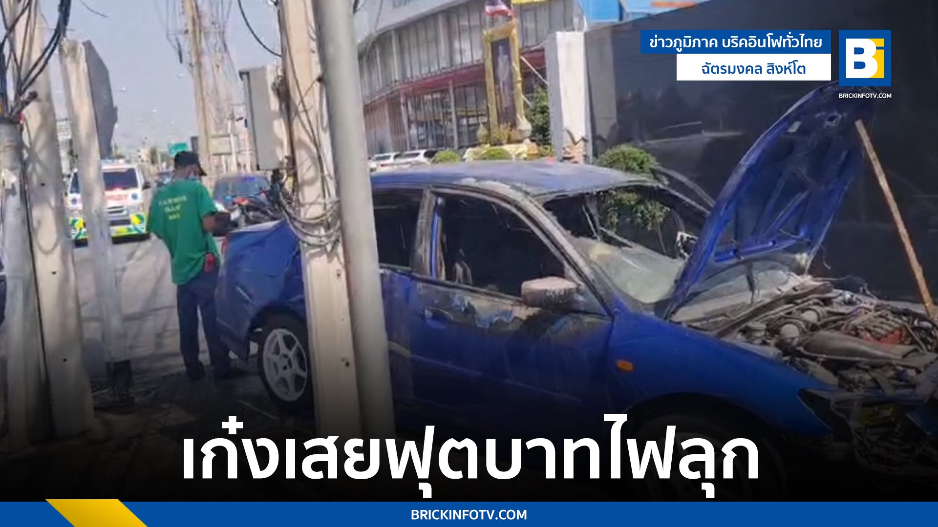 นนทบุรี หนุ่มหลับในซิ่งเก๋งเสยฟุตบาทไฟลุกไหม้ โชคดีหนีออกมาทัน