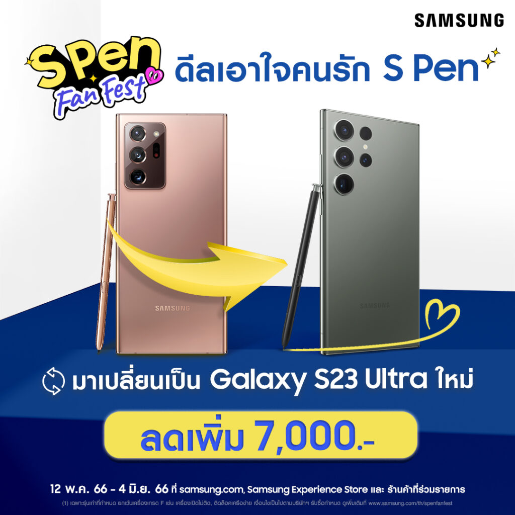 โอกาสทองสำหรับสาวก S Pen มาถึงแล้ว! แน่นอนว่ากระแสของ Galaxy S23 Ultra เป็นอีกหนึ่งสมาร์ทโฟนที่มาแรงกระแสไม่มีตกตั้งแต่เปิดตัว ที่มาพร้อมกับประสิทธิภาพของ S Pen ที่ต้องร้องว้าว อีกทั้งยังเป็นปากกาที่มาพร้อมฟีเจอร์เด็ดอีกมากมาย ถือว่าเป็นปากกาที่เต็มไปด้วยประโยชน์ในการใช้งานในทุกรูปแบบ ไม่ว่าจะเป็นการทำงาน เล่นเกม รวมไปถึงแต่งรูปให้สวยสะบัดก็สามารถทำได้อย่างครบถ้วนสมบูรณ์แบบ และตอนนี้ซัมซุงได้มีการจัดโปรโมชันสุดพี๊คคค! กับดีลสำหรับคนรัก S Pen เพียงนำ Galaxy Note8, Note9, Note10 Series, Note20 Series หรือ Galaxy S22 Ultra เครื่องเก่ามาเปลี่ยนเป็น Galaxy S23 Ultra ก็จะได้รับส่วนลดเพิ่มถึง 7,000 บาทจากราคาประเมิน โดยสาวกคนรัก S Pen คนไหนอยากมาลองสัมผัสความพี๊คคคของ Galaxy S23 Ultra ก็สามารถมาแลกได้ตั้งแต่วันที่ 12 พฤษภาคม – 4 มิถุนายน 2566ที่ samsung.com, Samsung Experience Store และร้านค้าที่ร่วมรายการ
