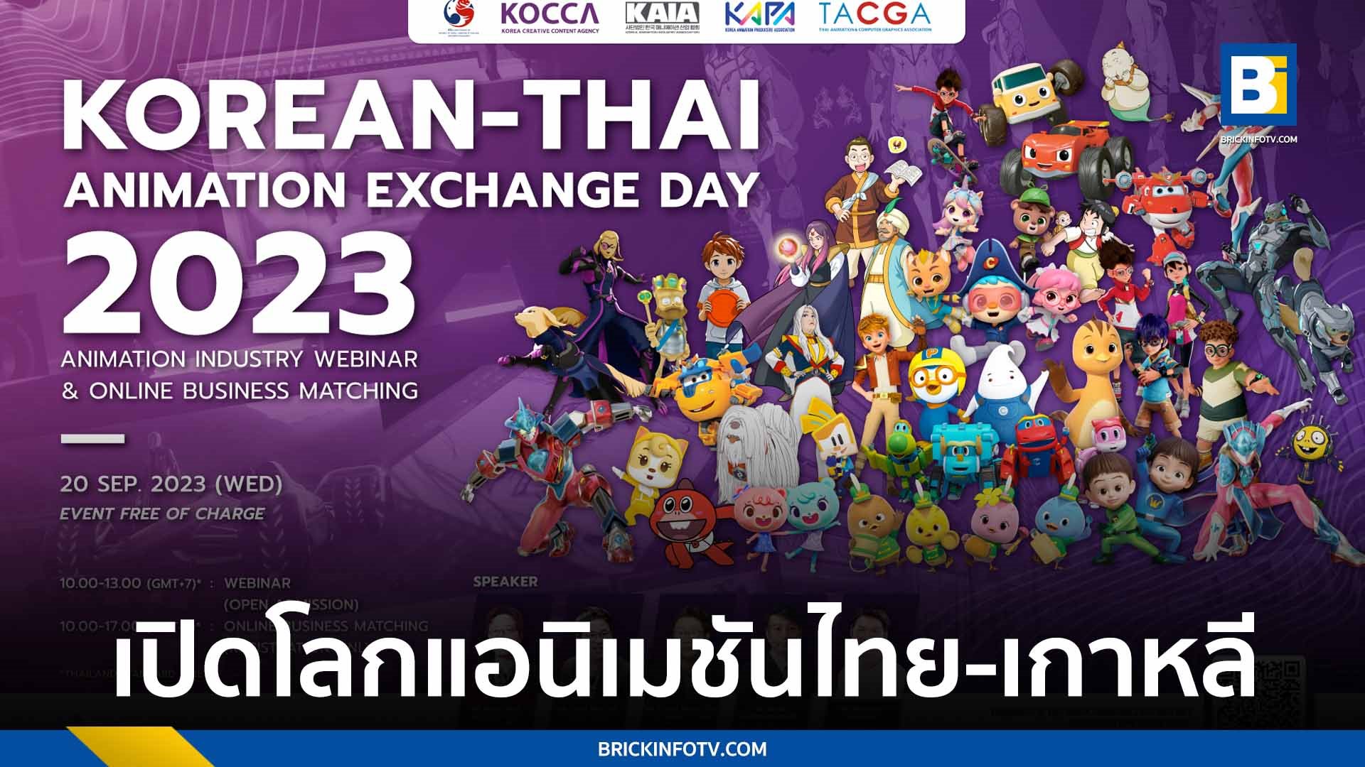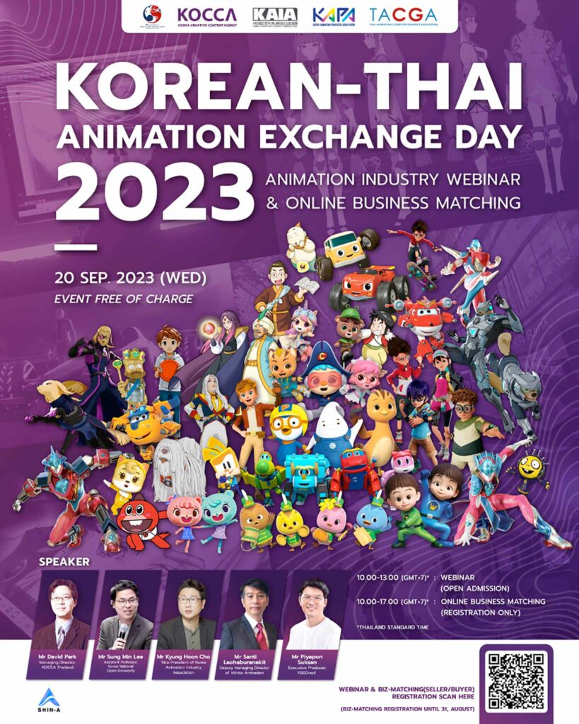 เตรียมพบกับงานสัมมนาออนไลน์ Korean-Thai Animation Exchange Day 2023 ในหัวข้อ Animation Industry Webinar & Online Business Matching ในวันพุธที่ 20 กันยายนนี้ งานเดียวที่อัดแน่นความรู้จากผู้เชี่ยวชาญในอุตสาหกรรม Animation จากประเทศไทยและประเทศเกาหลีใต้ พร้อมเปิดโอกาสให้ผู้ที่สนใจได้เป็นเจ้าของคอนเทนต์แอนิเมชันหรือลิขสิทธิ์ IP ของประเทศเกาหลีใต้ จัดโดย Korea Creative Contents Agency (KOCCA) หน่วยงานส่งเสริมอุตสาหกรรมสื่อสร้างสรรค์ของรัฐบาลเกาหลีใต้ ผนึกกำลังร่วมกับ Korea Animation Production Association (KAPA), Korean Animation Industry Association (KAIA), และ Thai Animation and Computer Graphics Association (TACGA)
