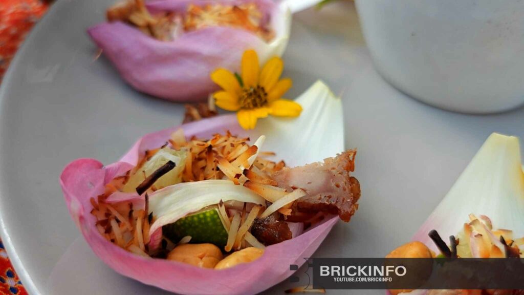 โดย “กินแบบคนมีตรัง กินแบบคนมีตังค์” ในอีกเมนูก็คือ เมนูเมี่ยงหมูย่าง ที่ได้รังสรรค์เมนูนี้ด้วยการพายเรือไปเก็บดอกบัวที่ปลูกเองในสระของทางร้าน แล้วนำมาทำเป็นเมี่ยงหมูย่างโดย พร้อมกินคู่กับสมุนไพร เช่น มะนาวศรีทองดำที่กินได้ทั้งเปลือกหนึ่งเดียวในไทย มีใส่พริก ขิง ตะไคร้ หลากชนิดและใช้กลีบบัวสดห่อ แทนใบชะพลู ทานคู่กับน้ำเมี่ยง รสชาติกลมกล่อมเค็มนิดหวานหน่อย