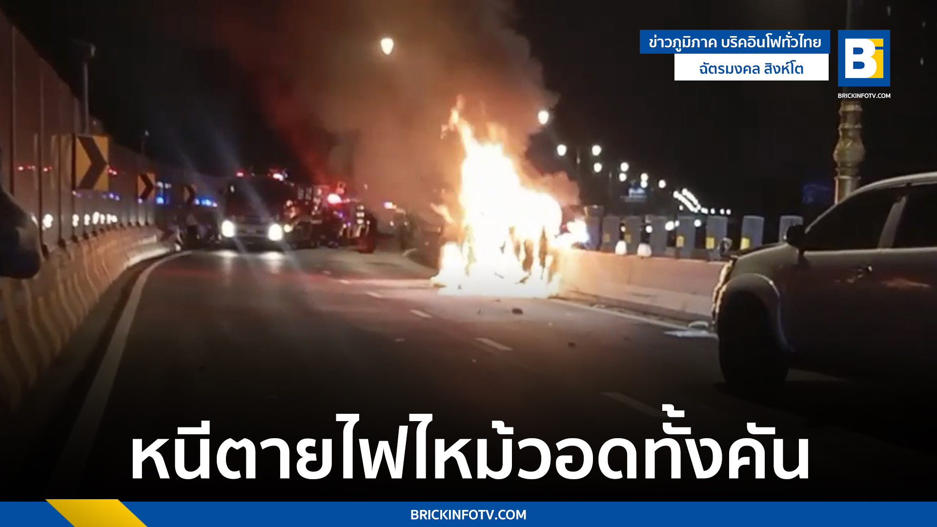 นนทบุรี ระทึก สาวขับเก๋งเกิดอุบัติเหตุชนขอบปูนพลิกตะแคง รีบคลานหนีตาย ก่อนไฟไหม้วอดทั้งคัน