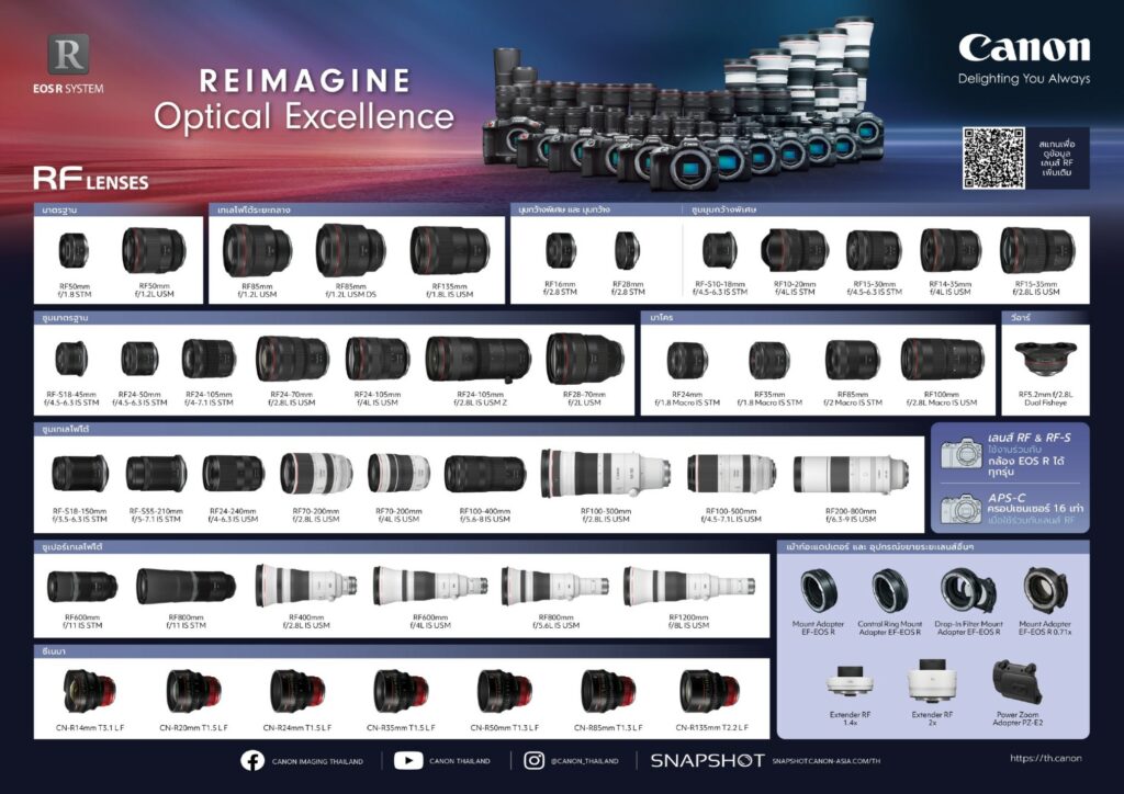 แคนนอน (Canon) แบรนด์ผู้นำด้านโซลูชันการถ่ายภาพระดับโลก เดินหน้าเปิดตัวเลนส์ 3 รุ่นใหม่ล่าสุดในตระกูล RF ที่ตอบโจทย์สายครีเอเตอร์ยุคใหม่ได้อย่างครอบคลุม ทั้งเลนส์มุมกว้างน้ำหนักเบา (RF-S10-18mm f/4.5-6.3 IS STM) เลนส์ซูมมาตรฐานสำหรับมือโปร (RF24-105mm f/2.8 L IS USM Z) และเลนส์ซูมซูเปอร์เทเลโฟโต้รุ่นแรกของโลก (RF200-800mm f/6.3-9 IS USM) และเลนส์รุ่นต่าง ๆ อีกมากมาย ตอกย้ำสถานะแบรนด์ผู้นำด้านการถ่ายภาพที่มีไลน์อัพเลนส์มากกว่า 100 รุ่น จนครองใจสายกล้องในเมืองไทยมาอย่างยาวนาน