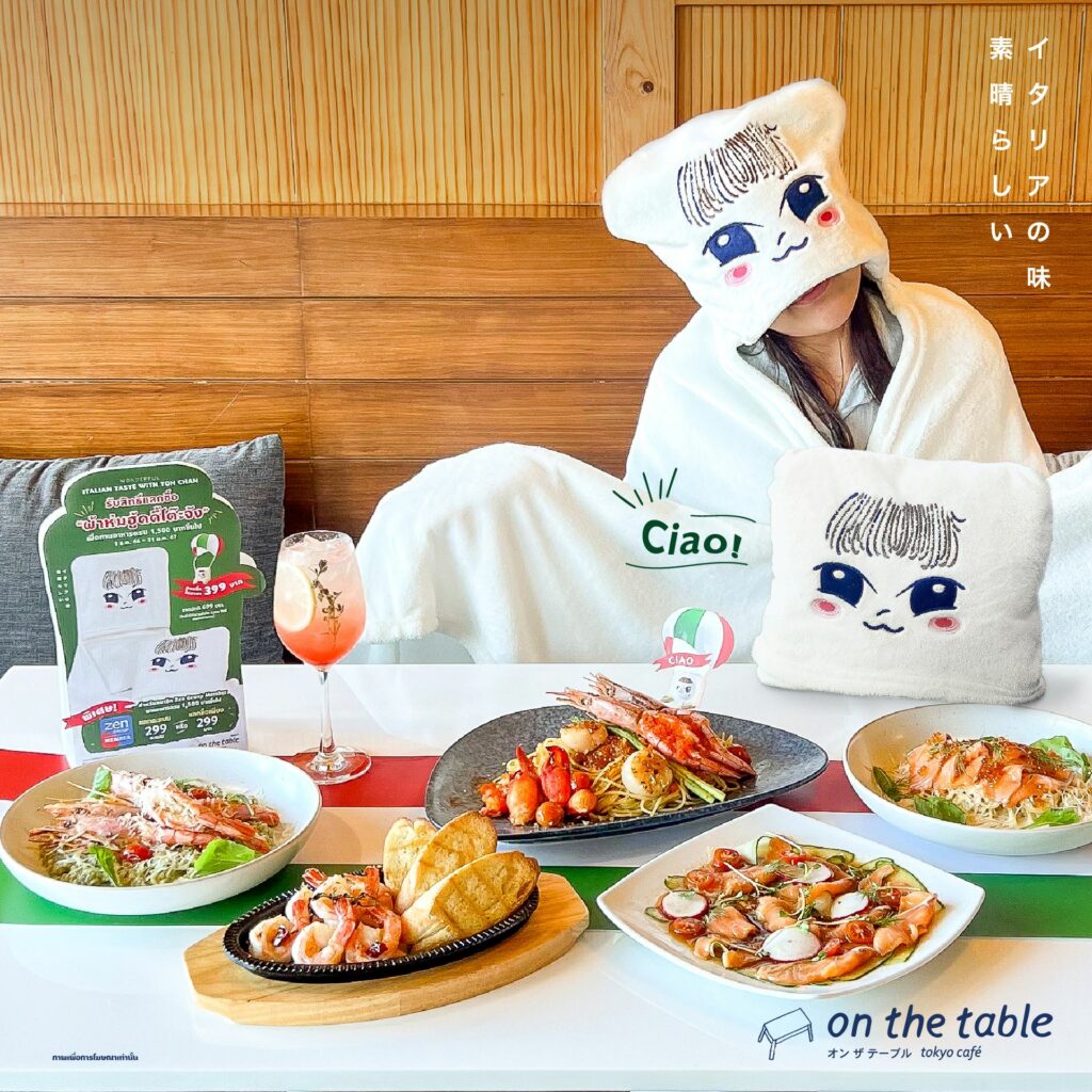 ออน เดอะ เทเบิ้ล (On the Table) เน้นการสร้าง Brand Engagement กับลูกค้ารุ่นใหม่ กลุ่มเพื่อน ครอบครัว และพนักงานออฟฟิต ผ่านการใช้ ‘โต๊ะจัง’ แบรนด์คาแรคเตอร์ที่มาสร้างกระแสไปทั่วโซเชียล ต่อยอดสู่การผลิตมาสคอตตัวเป็น ๆ ส่งตรงจากญี่ปุ่น และในช่วงเทศกาลส่งท้ายปี โต๊ะจัง พาสาว ๆ ไปพักร้อนปลายปีถึงอิตาลี กับแคมเปญชวนเฉลิมฉลอง ‘Wonderful Italian Taste with Toh Chan’ สัมผัสเมนูหลากหลายสไตล์อิตาลี เนรมิต New Year Party กับ 7 เมนูใหม่ สปาเก็ตตี้ซีฟู้ดบายเลคโคโม, สโม๊คแซลมอนคาปาชโชว์, กุ้งผัดเนยกระเทียมอิตาเลี่ยน,สปาเก็ตตี้สโม๊คแซลมอนครีมเลมอน, รีซอตโต้เพสโต้กุ้งย่าง, เครื่องดื่มพีชอโลเวร่าโซดา, ของหวาน โทสต์ทิรามิสึ และสำหรับสมาชิก ZEN GROUP เมื่อทานอาหารครบ 1,500 บาทขึ้นไป แลกความน่ารัก กับ “TOH CHAN HOODIE BLANKET (ผ้าห่มฮูดดี้โต๊ะจัง) สมาชิกสามารถแลกคะแนน 299 คะแนน หรือ แลกซื้อเพียง 299 บาท เท่านั้น โปรโมชั่นตั้งแต่ 1 ธันวาคม 2566 – 31 มกราคม 2567 ที่ร้าน ออน เดอะ เทเบิ้ล ทุกสาขา