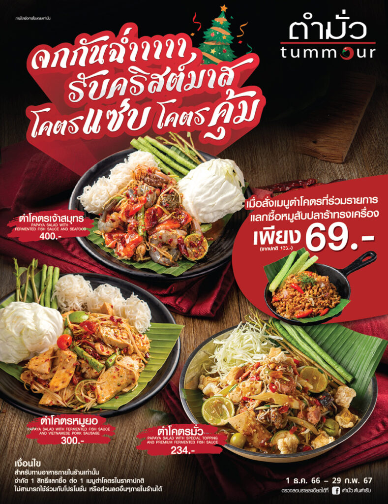 ตำมั่ว (Tummour) ส่งแคมเปญปลายปีตอกย้ำความมั่วระดับตำนาน เน้นการสร้าง Experience ใหม่ให้กับลูกค้าเดิม และขยายฐานลูกค้าใหม่ กับแคมเปญ ‘โคตรแซ่บ โคตรคุ้ม’ เสิร์ฟ 3 เมนู ตำโคตรมั่ว, ตำโคตรเจ้าสมุทร, ตำโคตรหมูยอ จัดหนัก จัดเต็ม แบบไม่หวงเครื่อง มาพร้อมโปรโมชั่นแลกซื้อเมนูหมูสับปลาร้าทรงเครื่อง 1 จาน เพียง 69 บาท (จากราคาปกติ 135 บาท) เมื่อซื้อเมนูตำโคตร (ที่ร่วมรายการ) ตั้งแต่ 1 ธันวาคม 2566 – 29 กุมภาพันธ์ 2567