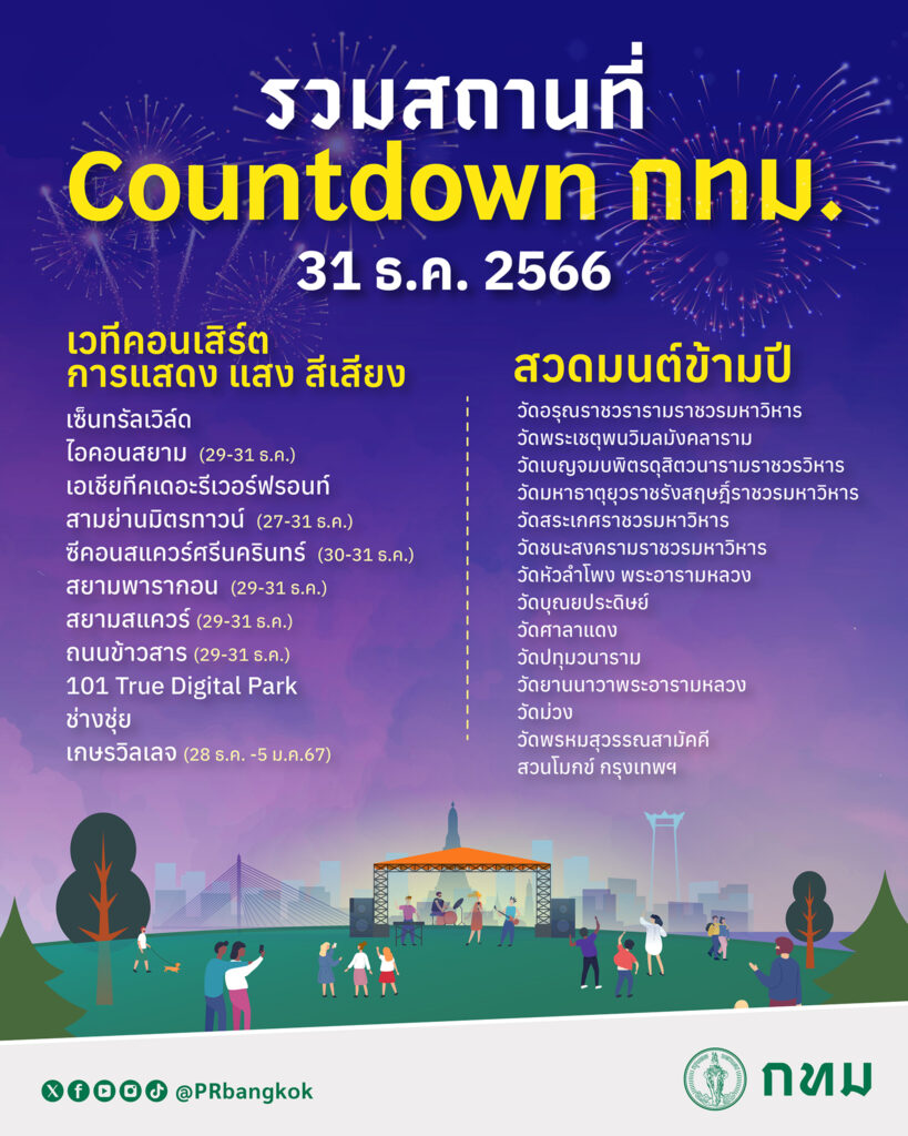 (29 ธ.ค.66) นายเอกวรัญญู อัมระปาล โฆษกของกรุงเทพมหานคร แจ้งว่า กรุงเทพมหานครขอเชิญชวนร่วมเฉลิมฉลองปีใหม่ในกรุงเทพมหานคร โดยสามารถเลือกรูปแบบได้ตามความชอบ สำหรับผู้ที่อยากดื่มด่ำกับบรรยากาศครึกครื้น เวทีคอนเสิร์ตการแสดง แสง สีเสียง มีหลายหน่วยงานได้จัดกิจกรรม countdown ส่งท้ายปี เช่น เซ็นทรัลเวิลด์ ไอคอนสยาม (29-31 ธ.ค.66) เอเชียทีคเดอะรีเวอร์ฟรอนท์ สามย่านมิตรทาวน์ (27-31 ธ.ค.66) สยามพารากอน (29-31 ธ.ค.66) สยามสแควร์ (29-31 ธ.ค.66) ถนนข้าวสาร (29-31 ธ.ค.66) 101 True Digital Park ช่างชุ่ย และเกษรวิลเลจ (28 ธ.ค.66 -5 ม.ค.67)