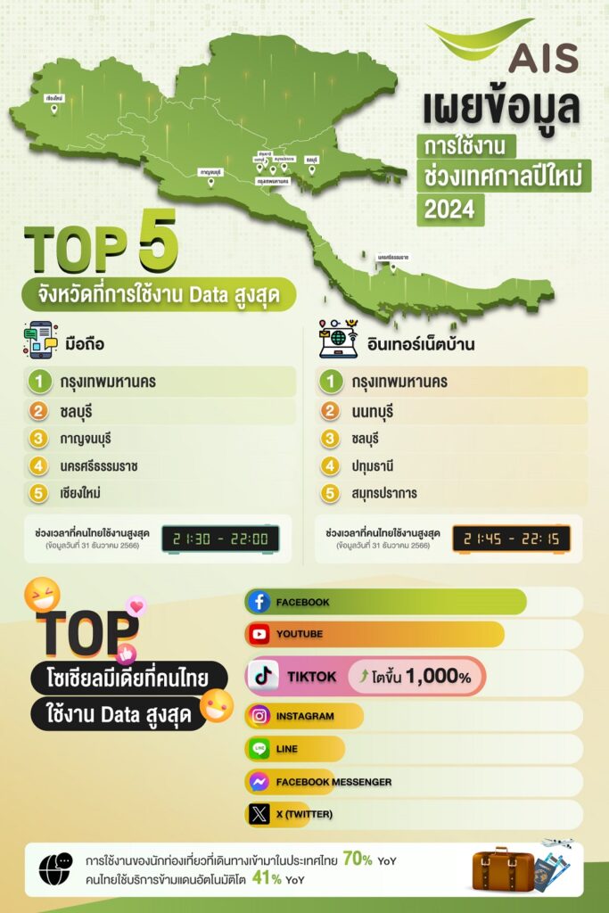 - จังหวัดที่มีการใช้งาน Data ผ่านมือถือสูงสุดเรียงตามลำดับ คือ กรุงเทพมหานคร, ชลบุรี, กาญจนบุรี นครศรีธรรมราช และเชียงใหม่ โดยช่วงเวลาที่ใช้งานสูงสุดคือ คืนวันที่ 31 ธันวาคม 2566 ตั้งแต่เวลา 21.30 น. เป็นต้นไป