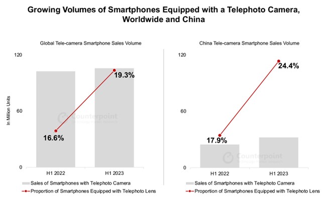 การศึกษายังพบว่าการใช้เลนส์เทเลโฟโต้ในตลาดมวลชนกำลังเพิ่มขึ้นอย่างรวดเร็ว โดยเฉพาะอย่างยิ่งในกลุ่มสมาร์ตโฟนราคาประหยัดของจีน มียอดขายสมาร์ตโฟนเลนส์เทเลโฟโต้เพิ่มขึ้นอย่างน่าทึ่ง โดยเป็นส่วนสำคัญของตลาดภายในไตรมาสที่ 3 ปี 2023