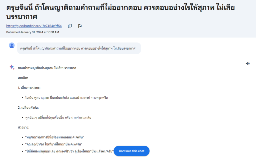ในช่วงตรุษจีน หลายๆ คนอาจต้องเผชิญกับสารพัดคำถามจากบรรดาญาติพี่น้องที่อาจทำให้รู้สึกอึดอัดใจ เช่น มีแฟนหรือยัง เมื่อไหร่จะแต่งงาน ตอนนี้ทำงานอะไร ตำแหน่งอะไร ได้เงินเดือนเท่าไหร่ เป็นต้น ไม่ต้องกังวล Bard สามารถช่วยคิดคำตอบเพื่อให้คุณรับมือกับคำถามเหล่านี้อย่างมีสติได้
