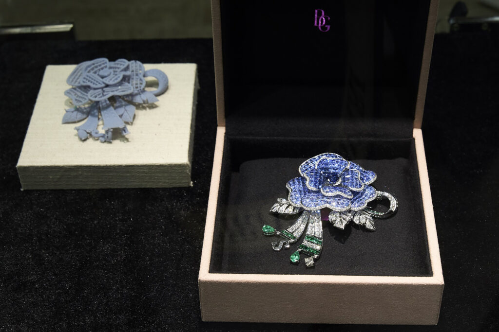 สำหรับเข็มกลัดรูปดอกกุหลาบสีน้ำเงิน “Rosa Bhubing Love at First Sight Gradient Brooch”สร้างสรรค์จากไพลิน (Blue Sapphire) ที่ผ่านการเจียระไนเป็นรูปทรงต่างๆ อย่างวิจิตรบรรจง และไล่เฉดสีอย่างพิถีพิถัน บริเวณฐานและใบของดอกเนรมิตจากเพชรและมรกตสร้างมิติที่งดงามเสมือนจริง โดยใช้เทคนิคการฝังไร้หนาม (Invisible Setting) สำหรับคอลเลกชัน “Heirlooms of Elegance” ประกอบด้วยผลงานเครื่องประดับ 41 ชิ้น แสดงพระอัจฉริยภาพทางสุนทรียศิลป์ขององค์ดีไซเนอร์เล่าเรื่องราวความรักความผูกพันในครอบครัว ถ่ายทอดผ่านงานจิวเวลรีอันล้ำค่าที่สืบทอดจากรุ่นสู่รุ่นผสมผสานอัตลักษณ์ของแบรนด์ โดยอาศัยความเป็นเลิศในเชิงหัตถกรรมเครื่องประดับผ่านช่างฝีมือชั้นสูงของ BEAUTY GEMS ผู้ที่สนใจสามารถลงทะเบียนติดต่อเข้าชมอัญมณีดังกล่าวได้ที่ https://www.bkkgems.com/