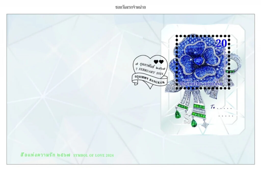 อัญมณี โดยช่างฝีมือชั้นครูจาก BEAUTY GEMS มาจัดทำเป็นแสตมป์ชุดสื่อแห่งความรัก 2567 ถ่ายทอดเบื้องหลังแห่งแรงบันดาลใจในงานทรงออกแบบเรื่องราวอันเปี่ยมด้วยความหมาย เชื่อมโยงกับกุหลาบสีน้ำเงินอันเป็นที่ทรงโปรดของสมเด็จพระนางเจ้าสิริกิติ์ พระบรมราชินีนาถ พระบรมราชชนนีพันปีหลวง ซึ่งพสกนิกรได้นำดอกกุหลาบควีนสิริกิติ์ ดอกไม้พระนามอันงดงามซึ่งเป็นดอกกุหลาบสีเหลือง ปลายกลีบสีส้มอ่อน มาย้อมสีน้ำเงินสดทูลเกล้าฯ ถวาย เมื่อครั้งเสด็จมาทรงงาน ณ พระตำหนักภูพิงคราชนิเวศน์ โดยองค์ดีไซเนอร์ได้ทรงออกแบบชิ้นงาน ให้มีความละเอียดอ่อนช้อย และทรงเลือกวาง สีอัญมณี ลูกเล่นของกลีบดอก ก้านและใบ สู่ชิ้นงานสุดล้ำค่าสมบูรณ์แบบโดยไปรษณีย์ไทยได้เลือกใช้เทคนิคการพิมพ์ ซิลค์สกรีนหมึกพิมพ์หลากสี พร้อมเคลือบกลิตเตอร์ เพิ่มประกายระยิบระยับใกล้เคียงอัญมณีจริง