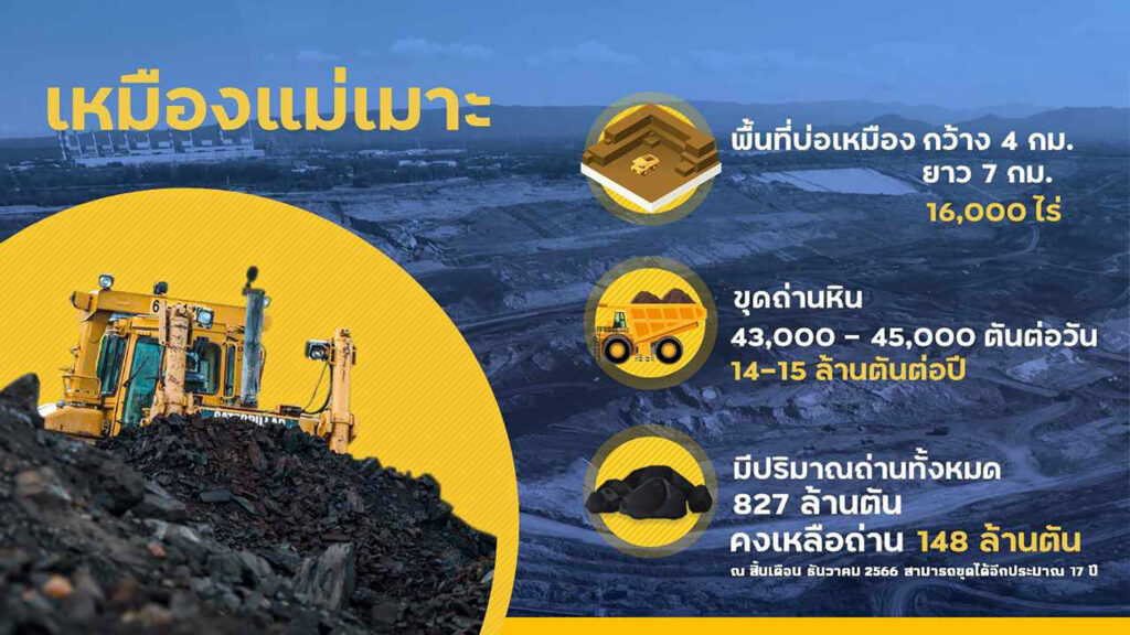 ทั้งนี้ กฟผ.แม่เมาะ ซึ่งประกอบไปด้วย 2 หน่วยงาน ทั้งเหมืองแม่เมาะและโรงไฟฟ้าแม่เมาะ ถือเป็นอีกหนึ่งความมั่นคงทางพลังงาน ช่วยลดภาระ และพยุงราคาต้นทุนค่าพลังงานของประเทศ โดยเหมืองแม่เมาะในปัจจุบันมีปริมาณถ่านหินลิกไนต์คงเหลือ 148 ล้านตัน (ณ สิ้นเดือนธันวาคม 2566) สามารถขุดได้อีกประมาณ 17 ปี จากปริมาณถ่านที่มีความคุ้มค่าทางเศรษฐกิจทั้งหมด 827 ล้านตัน