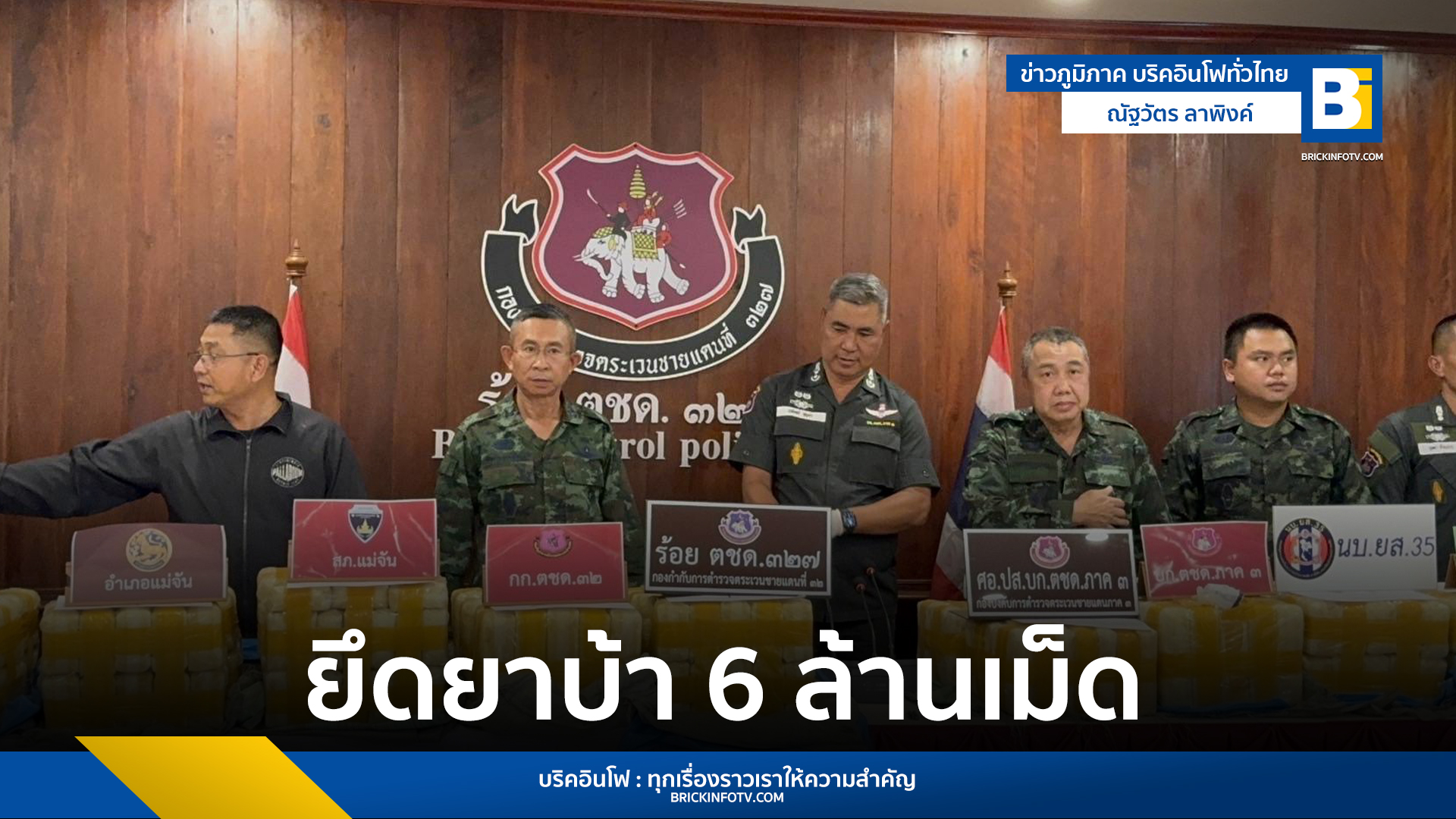 เวลา 14.00 น.วันที่ 2 มี.ค.67 ที่กองร้อย ตชด.327 อ.แม่จัน จ.เชียงราย พล.ต.ต.วรพงศ์ คำลือ ผบก.สส.ภ.5 พ.อ.กิดากร จันทรา รอง ผบ.กองกำลังผาเมือง ผบก.ภ.จว.เชียงราย พ.ต.อ.ภูมิชาย พันธ์กล้า ผกก.ตชด.32 พ.ต.อ. เกียรติศักดิ์ จิตรประสาร ผกก.สภ.แม่จัน พ.ต.ต.อนัญวัฒน์ รัตนวิชัย ผบ.ร้อย ตชด.327 และหน่วยงานที่เกี่ยวข้อง ได้ร่วมกันแถลงข่าว การสกัดกั้นยาเสพติด ยึดยาบ้าจำนวน 6,000,000 เม็ด