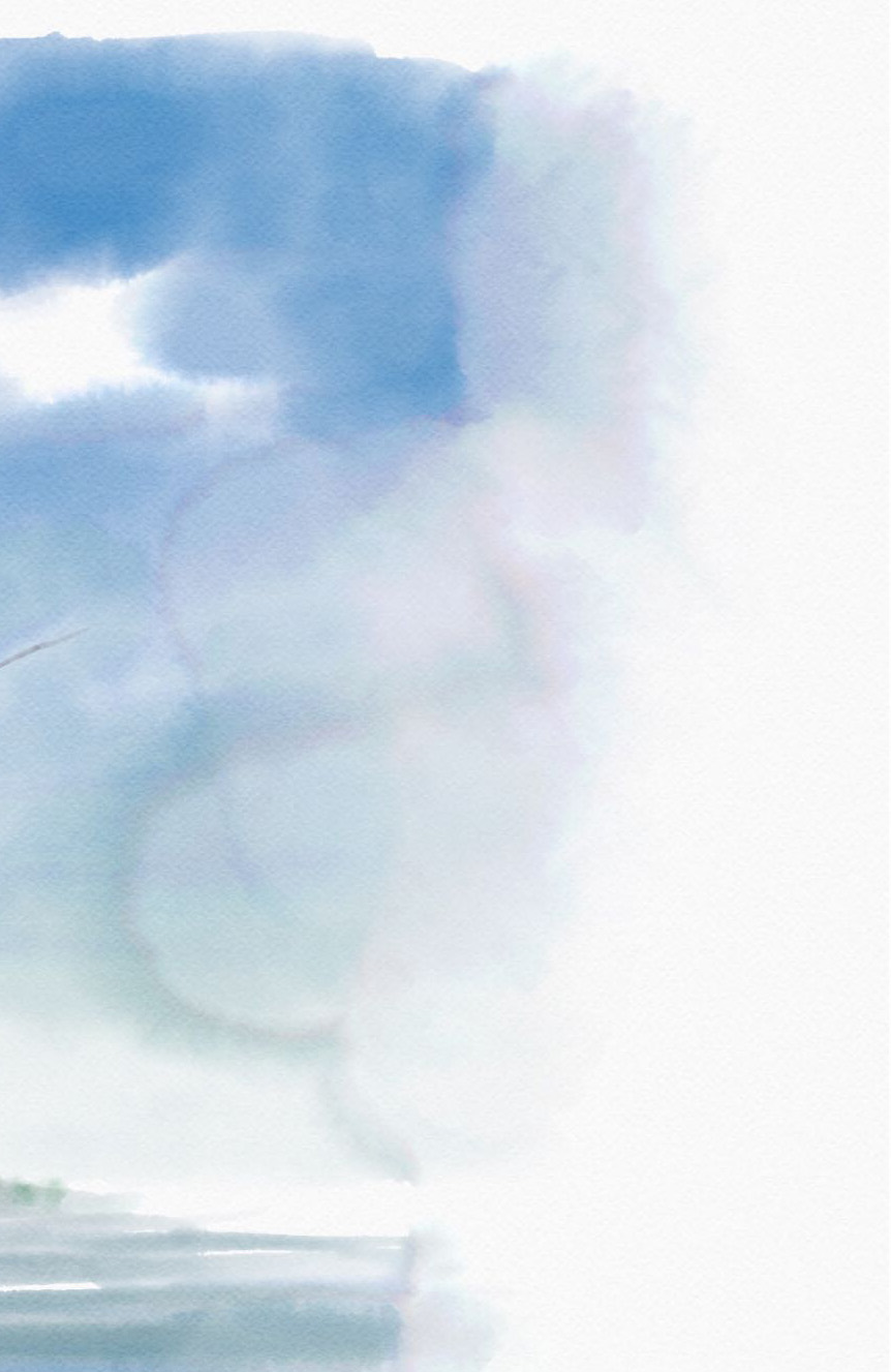 นอกจากนี้ ยังสามารถใช้โหมดการผสมเลเยอร์ของ Photoshop ในแอพ Fresco และสร้างเอฟเฟ็กต์ที่ลึกซึ้ง ซึ่งเป็นสิ่งที่ทำได้ยากมากถ้าคุณใช้วัสดุของจริงตามธรรมชาติ ตัวอย่างหนึ่งก็คือตรงบริเวณที่ดูอบอุ่นของท้องฟ้า ในตอนแรกผมระบายสีท้องฟ้าให้เป็นสีฟ้า แล้วใส่เลเยอร์เพิ่มเติมและระบายสีทับด้วยพู่กันแบบกลมที่อ่อนนุ่มและใช้สีเหลืองกับสีส้มผสมเข้าด้วยกัน ผมคัดลอกเลเยอร์สีที่อบอุ่นนี้และตั้งค่าให้เป็นโหมดผสมโอเวอร์เลย์ ซึ่งทำให้สีทั้งหมดที่อยู่ด้านล่างผสมกันและแต่งแต้มด้วยสีด้านบน ผมสามารถสร้างเอฟเฟ็กต์ที่ลึกซึ้งนี้โดยใช้วัสดุธรรมชาติ แต่จะต้องทำงานยุ่งยากหลายขั้นตอนเลยทีเดียว
