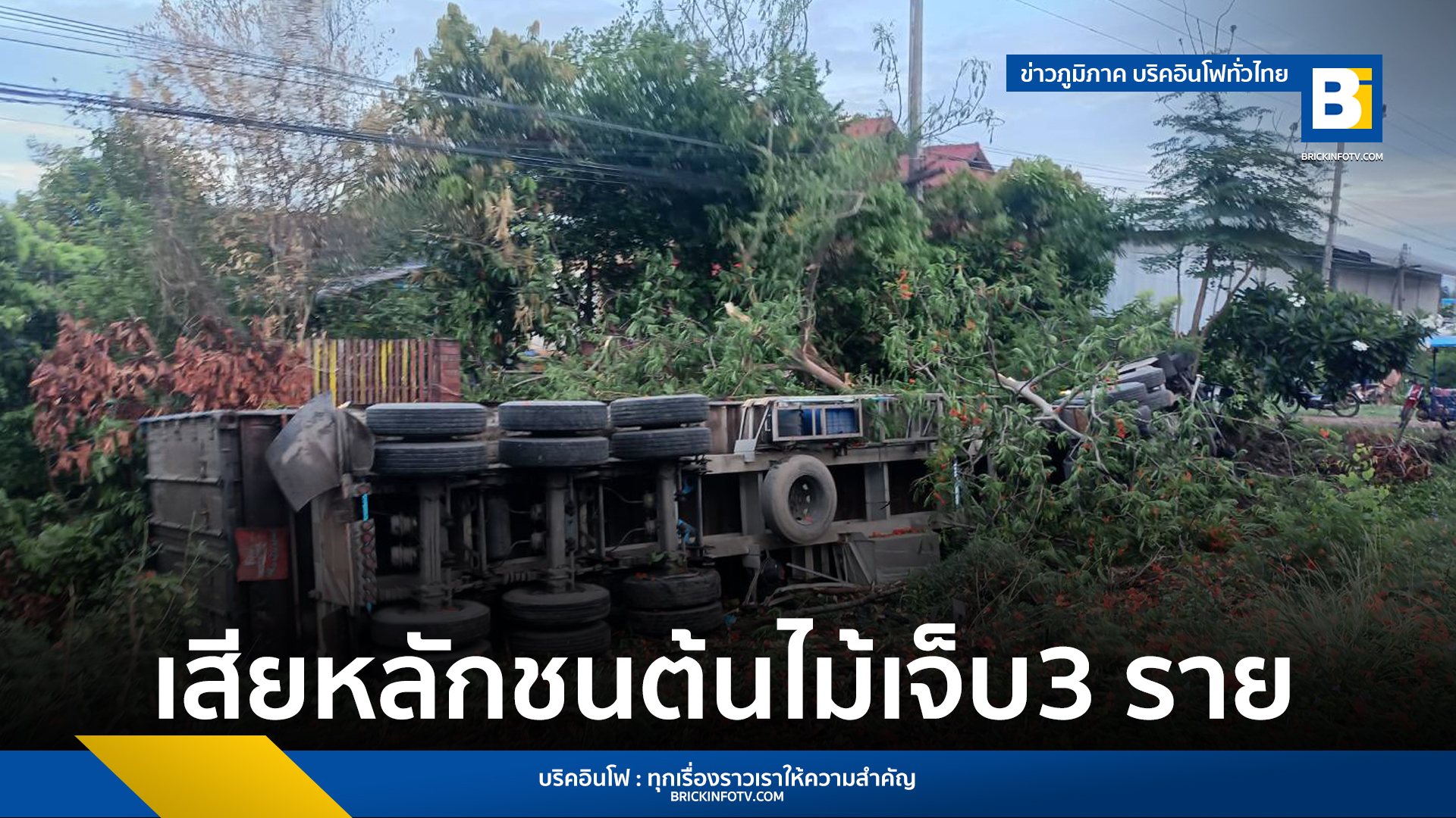 พะเยา รถบรรทุกคอนเทนเนอร์เสียหลักชนต้นไม้ รั้วบ้านข้างทาง เจ็บ3 ราย