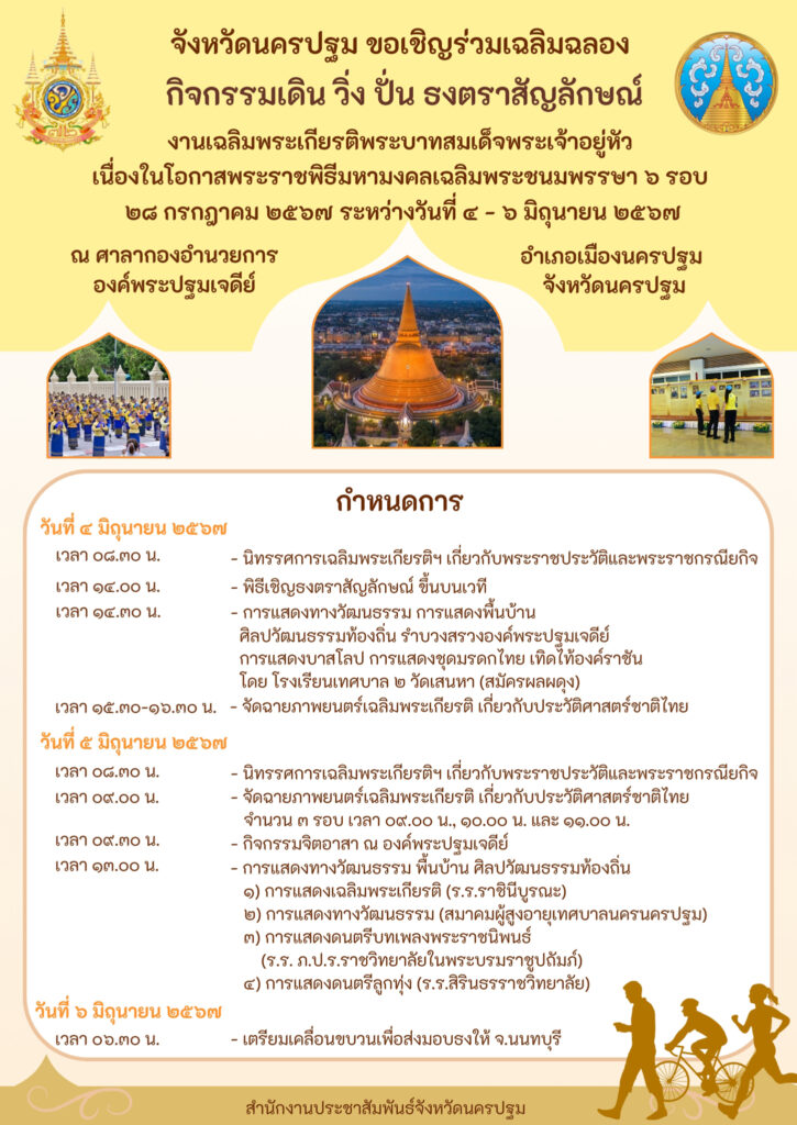 จังหวัดนครปฐม จึงขอเชิญชวนข้าราชการ เจ้าหน้าที่ และประชาชน เข้าร่วมกิจกรรมเดิน วิ่ง ปั่น ธงตราสัญลักษณ์ งานเฉลิมพระเกียรติพระบาทสมเด็จพระเจ้าอยู่หัว เนื่องในโอกาสพระราชพิธีมหามงคลเฉลิมพระชนมพรรษา 6 รอบ 28 กรกฎาคม 2567 ระหว่างวันที่ 4 – 6 มิถุนายน 2567 อย่างพร้อมเพรียงกัน