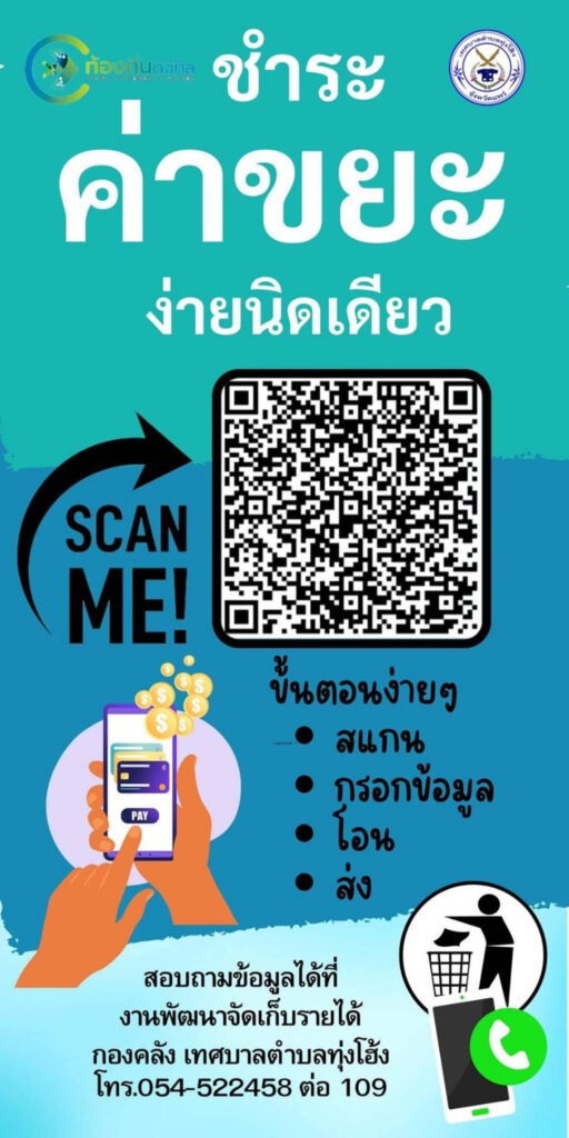 และเพื่อเป็นการอำนวยความสะดวก และเพิ่มการบริการให้กับพี่น้องประชาชนตำบลทุ่งโฮ้งอีกอย่างหนึ่ง ทางเทศบาลตำบลทุ่งโฮ้ง ได้เปิดใช้ระบบท้องถิ่นดิจิตอล ในการชำระค่าจัดเก็บขยะ (รายเดือน) ผ่านระบบออนไลน์ เน้นความสะดวก รวดเร็ว ถูกต้อง แม่นยำ เพียงแค่ท่านสแกนจ่ายผ่านคิวอาร์โค๊ดตามขั้นตอนง่ายๆ ดังนี้ 1. สแกนคิวอาร์โค๊ด 2. กรอกข้อมูล 3. โอน 4. ส่ง(สลิปโอนเงิน) สามารถสอบถามข้อมูลได้ที่ งานพัฒนาจัดเก็บรายได้ กองคลัง เทศบาลตำบลทุ่งโฮ้ง โทร 054-522458 ต่อ 109 ในวันและเวลาราชการได้