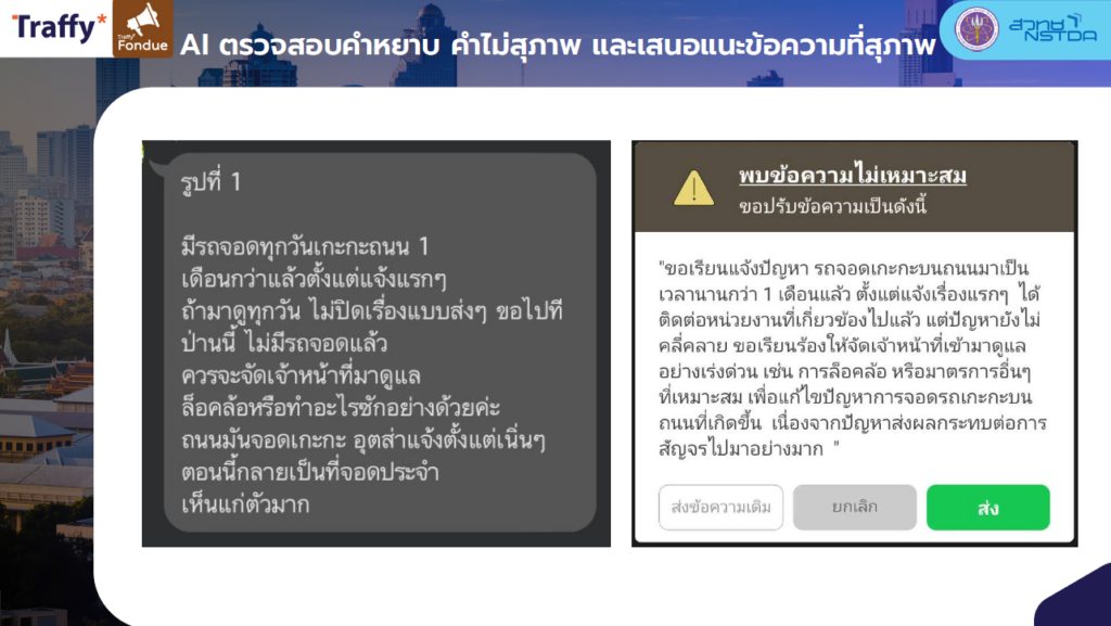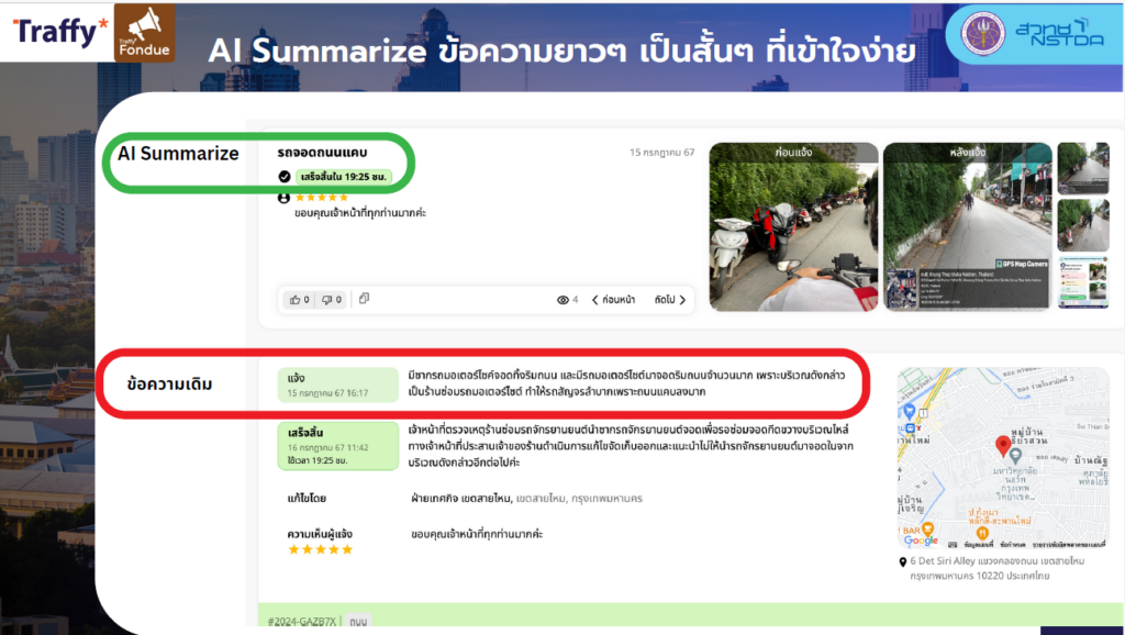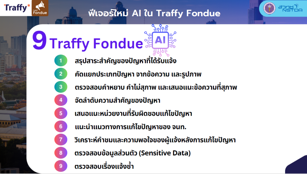 โดยนำเทคโนโลยี AI เข้ามาใช้บนบนแพลตฟอร์ม Traffy Fondue ที่จะช่วยให้การสื่อสารเรื่องแจ้งปัญหา มีประสิทธิภาพมากขึ้น ทำให้เจ้าหน้าที่เข้าใจปัญหาได้อย่างรวดเร็วและถูกต้อง ตอบโจทย์เรื่องที่แจ้งให้แก้ปัญหามากยิ่งขึ้น และตอบสนองความต้องการของประชาชนได้ดี สะท้อนการบริหารจัดการเมืองที่มีความโปร่งใสจากการมีส่วนร่วมของประชาชน