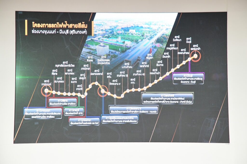 สำหรับโครงการรถไฟฟ้าสายสีส้ม ช่วงบางขุนนนท์ – มีนบุรี (สุวินทวงศ์) มีแนวเส้นทางเชื่อมระหว่างกรุงเทพฯ ทิศตะวันออกและทิศตะวันตก ระยะทาง 35.9 กิโลเมตร แบ่งเป็น ส่วนตะวันออก ช่วงศูนย์วัฒนธรรมแห่งประเทศไทย – มีนบุรี (สุวินทวงศ์) ระยะทาง 22.5 กิโลเมตร จำนวน 17 สถานี (สถานีใต้ดิน 10 สถานี และสถานียกระดับ 7 สถานี) และส่วนตะวันตก ช่วงบางขุนนนท์ – ศูนย์วัฒนธรรมแห่งประเทศไทย ระยะทาง 13.4 กิโลเมตร จำนวน 11 สถานี (สถานีใต้ดินตลอดสาย)